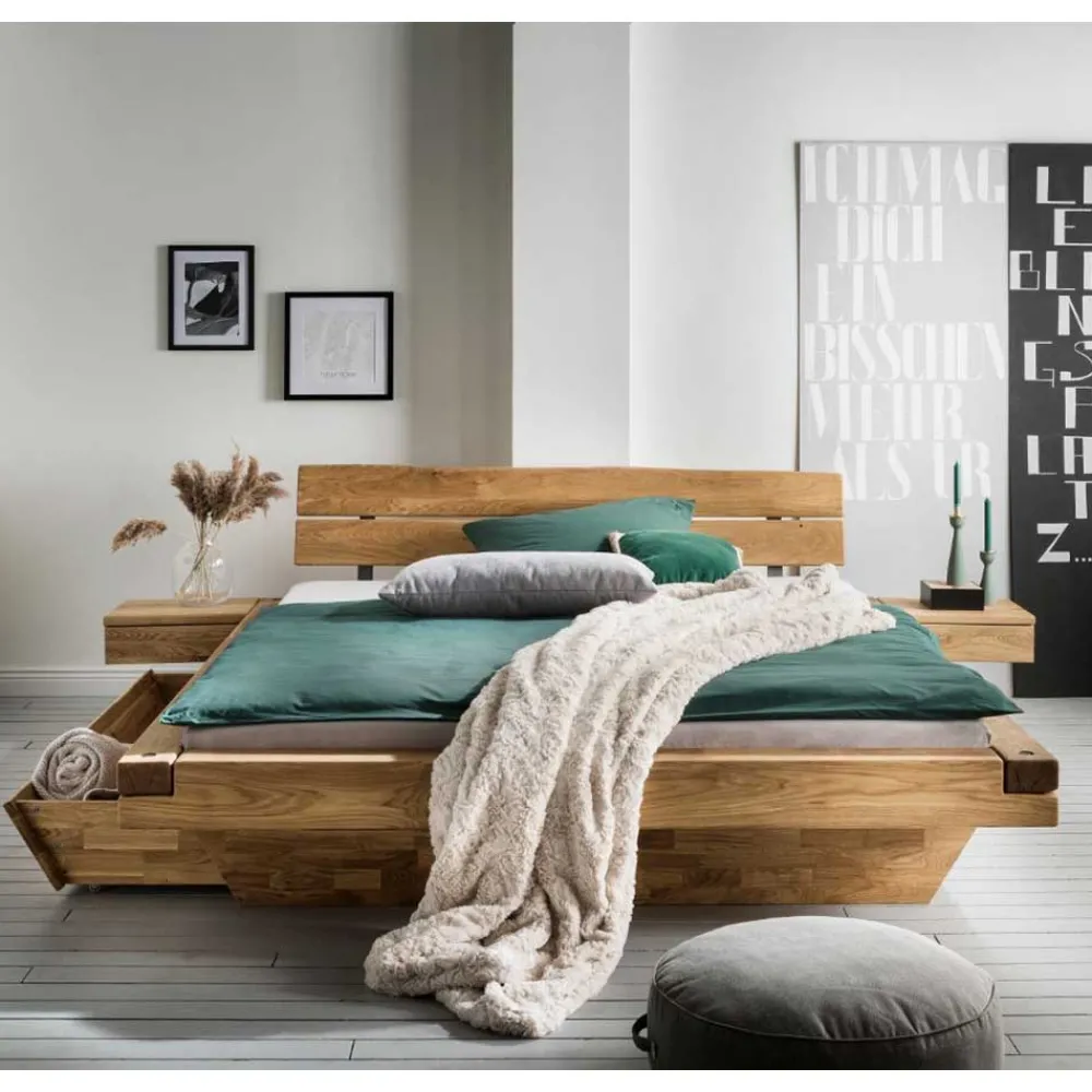 Zur Fertigung dieses Balkenbettes mit Baumkanten Kopfteil sowie der im Lieferumfang enthaltenden Nachtkonsolen und des optional in den Varianten 005 bis 008 erhältlichen Bettkastens kommt bestes Wildeiche Massivholz zum Einsatz. Die Oberflächen des Wildeiche Holzes sind natürlich geölt. Wildeiche begeistert durch eine besondere Ursprünglichkeit, die durch naturbelassene Wuchsspuren des Baumes, Risse und kleinere Astlöcher erreicht wird.