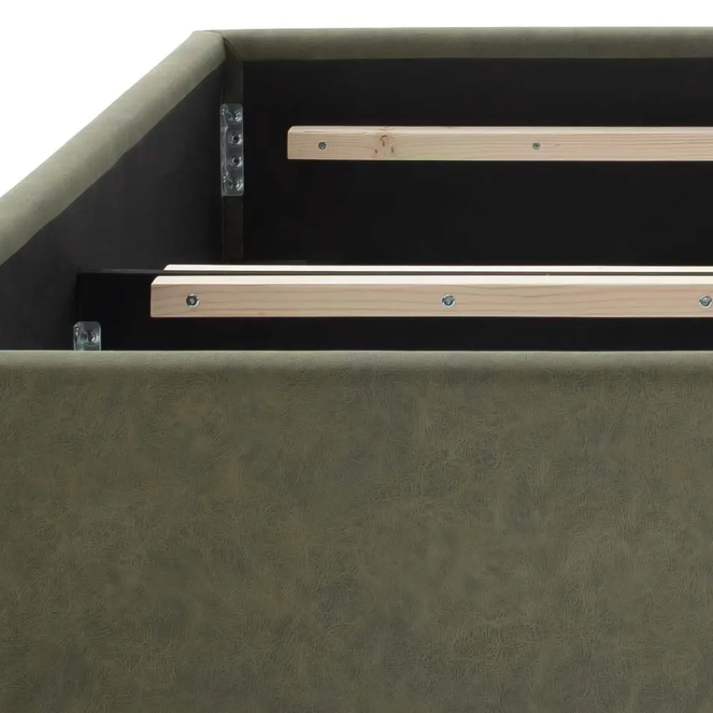 Das Kopfteil und die Bettrahmung sind mit einem oliv-grünen Microfaserbezug aus 100 % Polyester bezogen. Dieser Stoff zeichnet sich durch seine samtige Oberfläche aus, die zugleich robust und pflegeleicht ist. Die Rückseite des Kopfteils ist mit einem schwarzen Webstoff aus 100 % Polypropylen versehen, welcher nicht nur ästhetisch ansprechend ist, sondern auch eine hohe Strapazierfähigkeit mitbringt. Dank der unempfindlichen Oberflächen bleibt das Bett lange makellos und behält seine elegante Ausstrahlung.