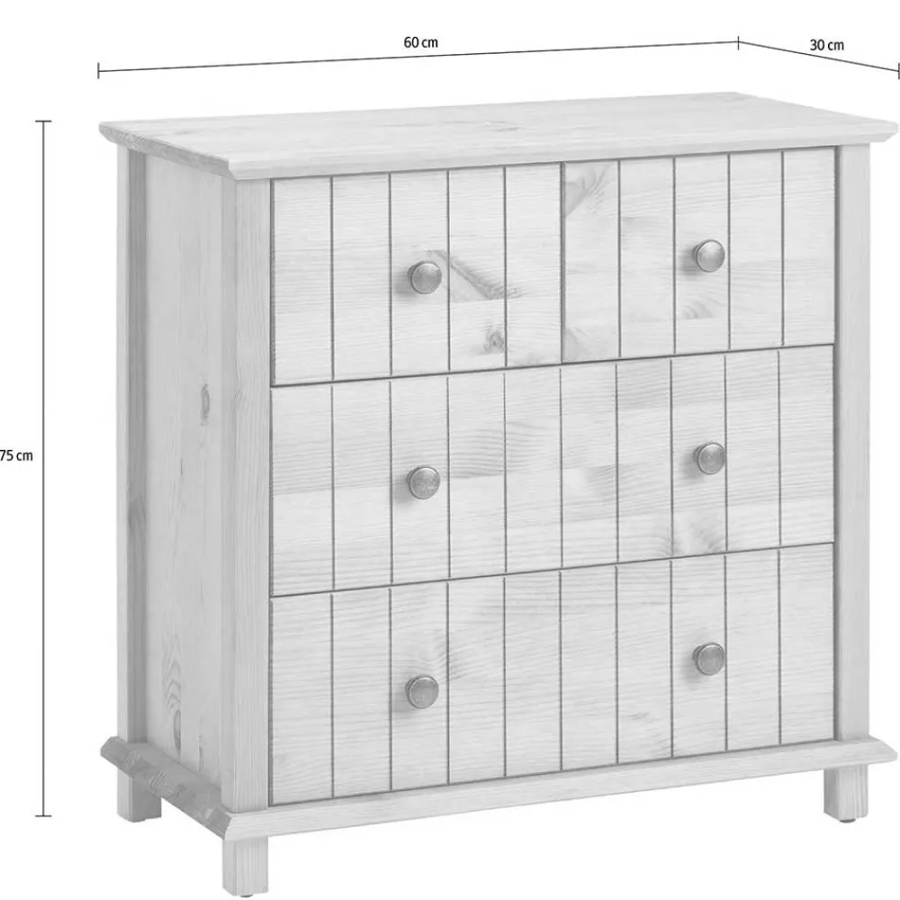 Mit ihren kompakten Maßen – 60 cm breit, 64 cm hoch und 30 cm tief – passt Akzinad ideal auch in kleinere Räume, ohne auf Stauraum zu verzichten. Vier großzügige Schubladen mit leichtgängigen Metallauszügen bieten viel Platz für Handtücher, Accessoires oder Alltagsgegenstände. Alles verschwindet ordentlich hinter den charmanten runden Metallknöpfen in antiker Optik – ein stilvolles Detail, das den nostalgischen Charakter dieser Kommode unterstreicht.