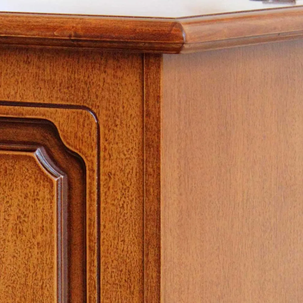 Die Truhe „Kimms“ besticht durch ihre klassische Formgebung und die ausgeklügelte Detailverarbeitung. Besonders auffällig ist die kunstvolle Gestaltung der Front, die mit feinen Fräsungen versehen ist. Diese aufwendige Handarbeit verleiht der Truhe eine besondere Eleganz und hebt sie von herkömmlichen Möbelstücken ab. Die sanft abgerundeten Kanten und die überstehende Deckplatte sorgen für einen weichen, harmonischen Übergang, der die Truhe zu einem echten Blickfang macht. In Kombination mit der edlen Nussbaumfarbe entsteht ein harmonisches Gesamtbild, das zeitlose Eleganz ausstrahlt.