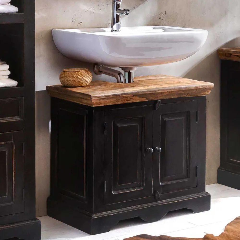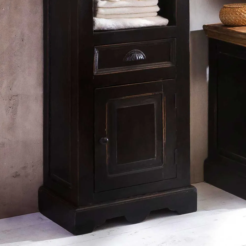 Die Möbel dieses Sets sind in schwarz mit einem Antik Finish lackiert, das den Kolonialstil unterstreicht. Die Deckplatten aus Massivholz sind honigfarbig lackiert, was einen optischen Akzent setzt und das Badezimmer mit einer natürlichen Ausstrahlung belebt. Die beabsichtigten Gebrauchsspuren auf den Oberflächen tragen zum Charme des Sets bei und erzeugen eine gemütliche, wohnliche Atmosphäre.