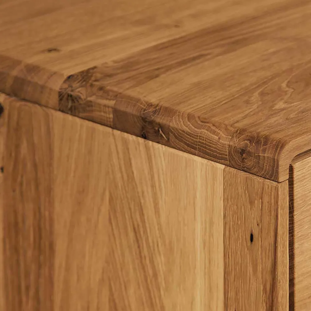 Die Oberfläche der Wildeiche ist natürlich geölt. Dieses Öl dringt tief in das Holz ein und schützt es von innen heraus vor äußeren Einflüssen. Gleichzeitig wird die natürliche Schönheit der Holzmaserung betont und verleiht der Kommode eine angenehme Haptik. Das Ölen bewahrt das Holz auch vor dem Austrocknen und sorgt für eine verlängerte Lebensdauer.
