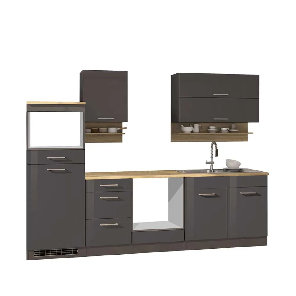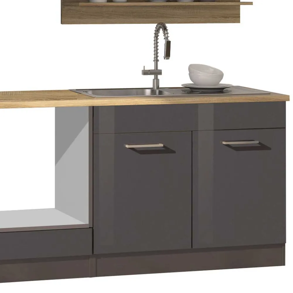 - Front grau Hochglanz foliert, Korpus grau melaminbeschichtet, Wandboards, Arbeits- und Ablagefläche in Holzoptik Sonoma Eiche