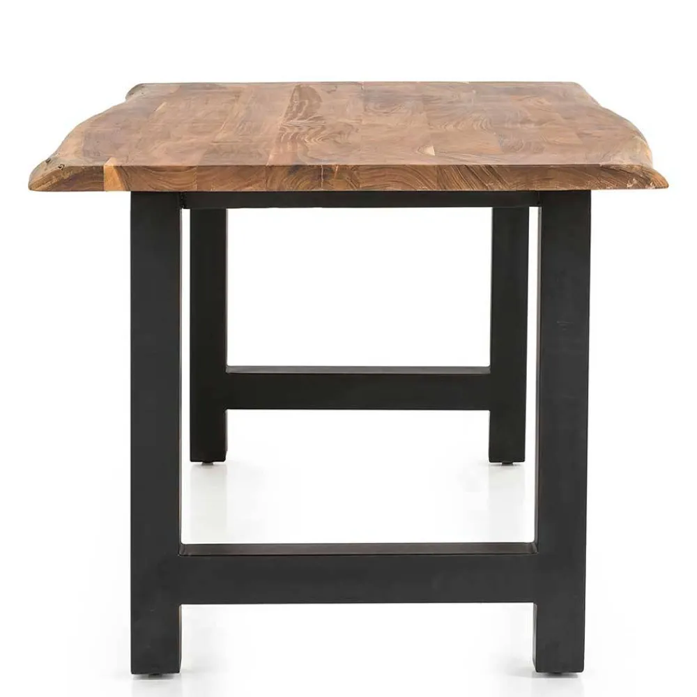 Die Tischplatte aus massivem Akazienholz beeindruckt mit einer Stärke von etwa 3,5 cm – ein echtes Statement. Geschnitten direkt aus dem Stamm und belassen mit ihrer natürlichen Baumkante, erzählt jedes Stück seine ganz eigene Geschichte. Diese Kante, unregelmäßig und organisch gewachsen, verleiht dem Tisch einen natürlichen, ursprünglichen Charme. Sie steht sinnbildlich für Individualität, Naturverbundenheit und echtes Handwerk.