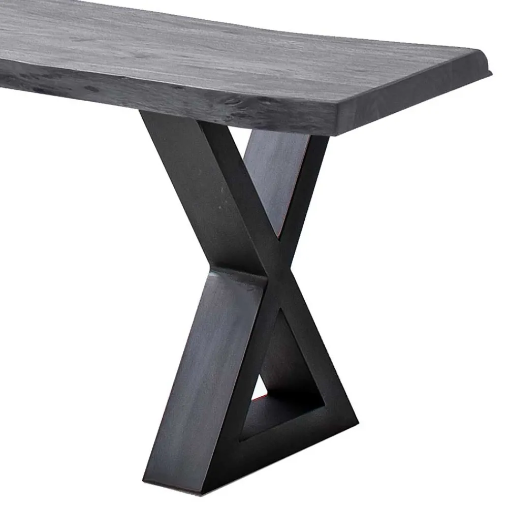 Die X-förmigen Beine aus Metall sind in Anthrazit lackiert und bieten durch ihre breite, durchgehende Bodenauflage maximale Stabilität. Diese markanten Beine unterstreichen den industriellen Look der Bank und sorgen gleichzeitig für einen sicheren Stand.