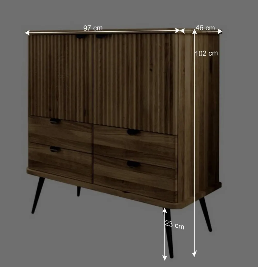 Das Highboard misst 97 cm in der Breite, 102 cm in der Höhe und 46 cm in der Tiefe und bietet somit viel Stauraum. Zwei Türen mit Soft Close Funktion und Metallbeschlägen ermöglichen ein sanftes und geräuschloses Schließen. Die Türfronten sind mit einer aufwändigen, plastischen Rillenstruktur gestaltet, die das Highboard zu einem echten Blickfang macht. Im Inneren verbirgt sich jeweils ein Einlegeboden für optimale Raumnutzung.