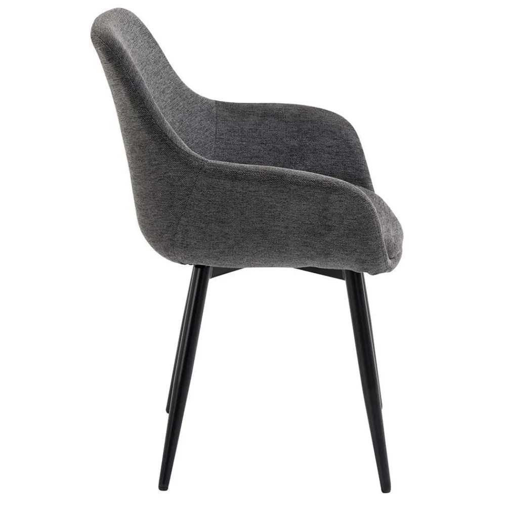 Die vier Stühle dieser Gruppe bieten nicht nur eine ansprechende Optik, sondern auch höchsten Sitzkomfort. Bezogen mit einem strapazierfähigen Strukturwebstoff in elegantem Anthrazit (100 % Polyester), fügen sie sich stilvoll in jede Einrichtung ein. Eine weiche Schaumstoffpolsterung sorgt für angenehmen Sitzkomfort, während die ergonomisch geformte Rückenlehne mit leichter Neigung den Rücken optimal unterstützt. Mit einer Sitzhöhe von 47 cm, einer Sitztiefe von 44 cm und einer Sitzbreite von 44 cm laden diese Stühle zu langen, gemütlichen Stunden am Tisch ein. Die stabilen, konisch zulaufenden Beine aus pulverbeschichtetem Metall in Schwarz sorgen für sicheren Stand und eine moderne Ästhetik.