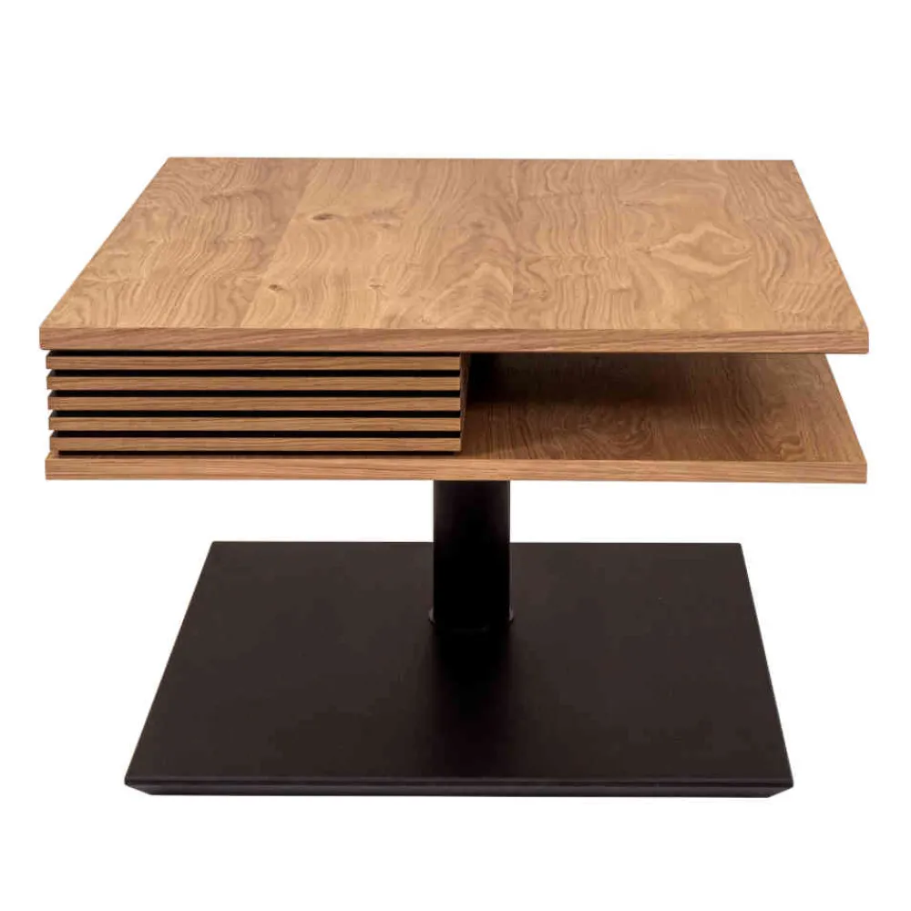 Nicht nur in der Optik, sondern auch in der Funktionalität punktet der „Portland“. Die solide Tischplatte ist nicht nur robust, sondern bietet mit ihrer 360-Grad-Drehfunktion maximale Flexibilität. So haben Sie stets alles im Blick und griffbereit. Unterhalb der Tischplatte finden Sie eine offene Ablagefläche sowie einen integrierten Ablagekasten. Diese bieten Ihnen zusätzlichen Stauraum für Zeitschriften, Fernbedienungen oder andere Alltagsgegenstände – perfekt organisiert und stilvoll verstaut. Die elegante Rillenfräsung an der MDF-Ablage in Schwarz und Wildeiche furniert setzt dabei weitere designstarke Akzente.