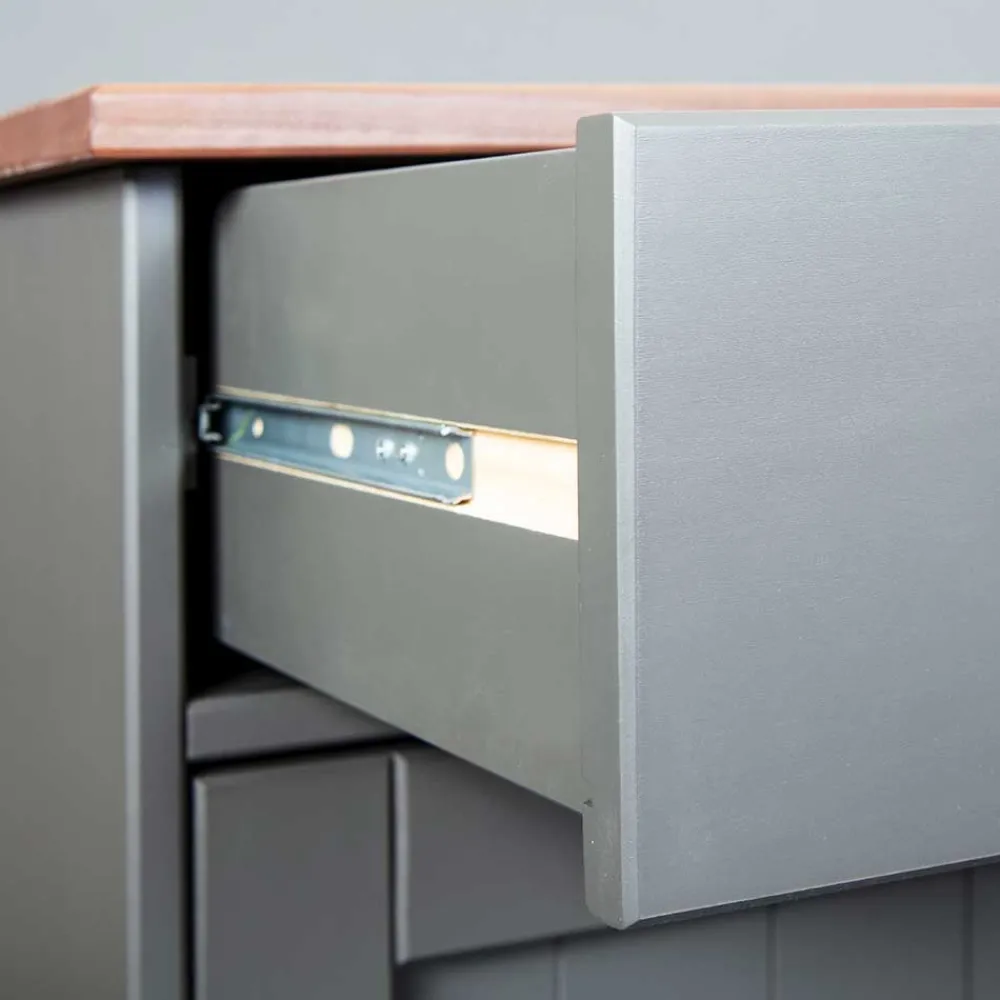Die feine Lackierung in Grau, kombiniert mit der Ablage- und Oberplatte in warmem Braun, verleiht dem Schrank einen ansprechenden Kontrast, der die Augen anzieht. Diese Farbgebung harmoniert perfekt mit dem natürlichen Charakter des Kiefernholzes und verleiht jedem Raum eine moderne Eleganz. Die Lackierung schützt das Holz nicht nur, sondern erleichtert auch die Pflege und Reinigung, sodass Ihr Schrank über Jahre hinweg wie neu aussieht.