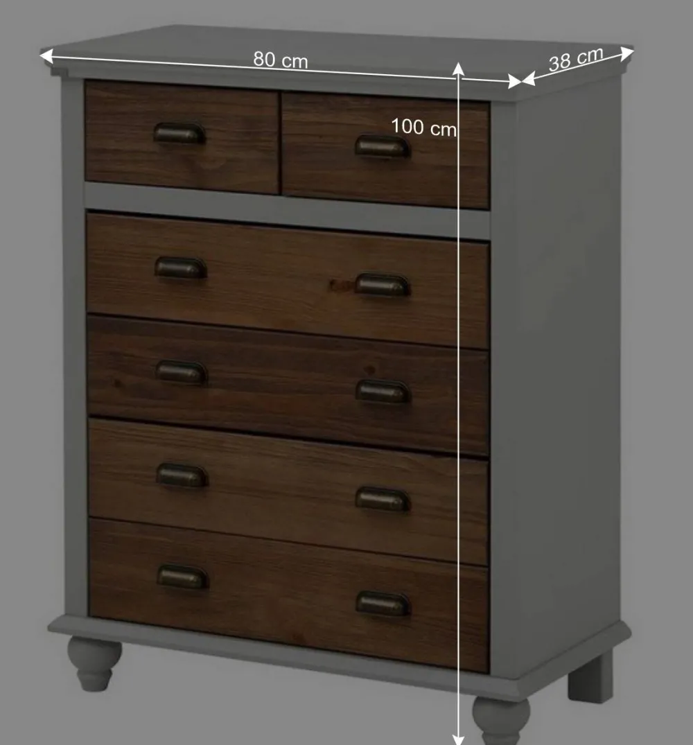 Die Hochkommode „Veproma“ vereint ländlichen Charme mit durchdachter Funktionalität. Ihr gelungenes Farbspiel aus warmem Holzbraun und sanftem Grau verleiht jedem Raum eine gemütliche Atmosphäre. Ob im Schlafzimmer, Flur oder Wohnbereich – dieses vielseitige Möbelstück schafft Ordnung und setzt zugleich stilvolle Akzente.