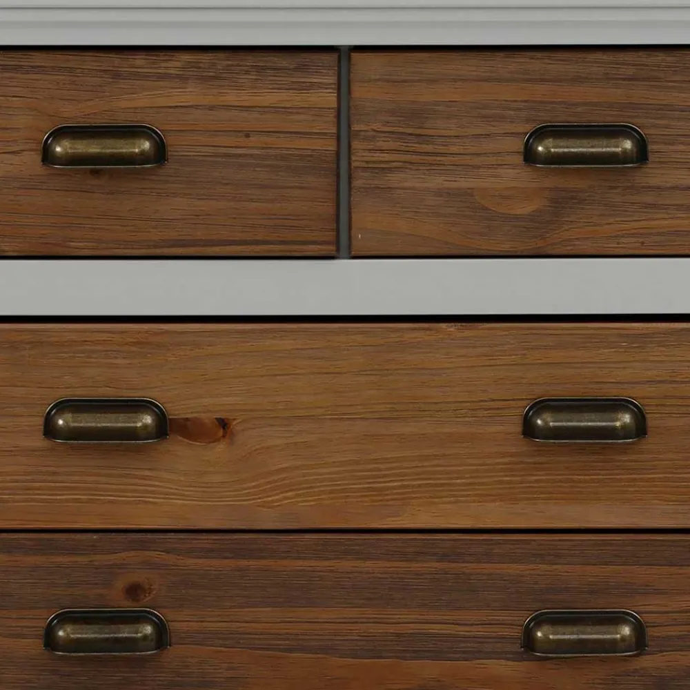 Ob Kleidung, Dokumente oder Alltagsgegenstände – mit sechs geräumigen Schubladen bietet die Kommode ausreichend Platz für eine übersichtliche Aufbewahrung. Zwei schmalere Schubladen oben eignen sich perfekt für kleinere Utensilien, während die vier größeren Schubladen darunter zusätzlichen Stauraum bereitstellen. Ein besonderer Hingucker sind die stilvollen Muschelgriffe aus Metall in Altmessing, die den Landhaus-Charakter wunderbar abrunden.
