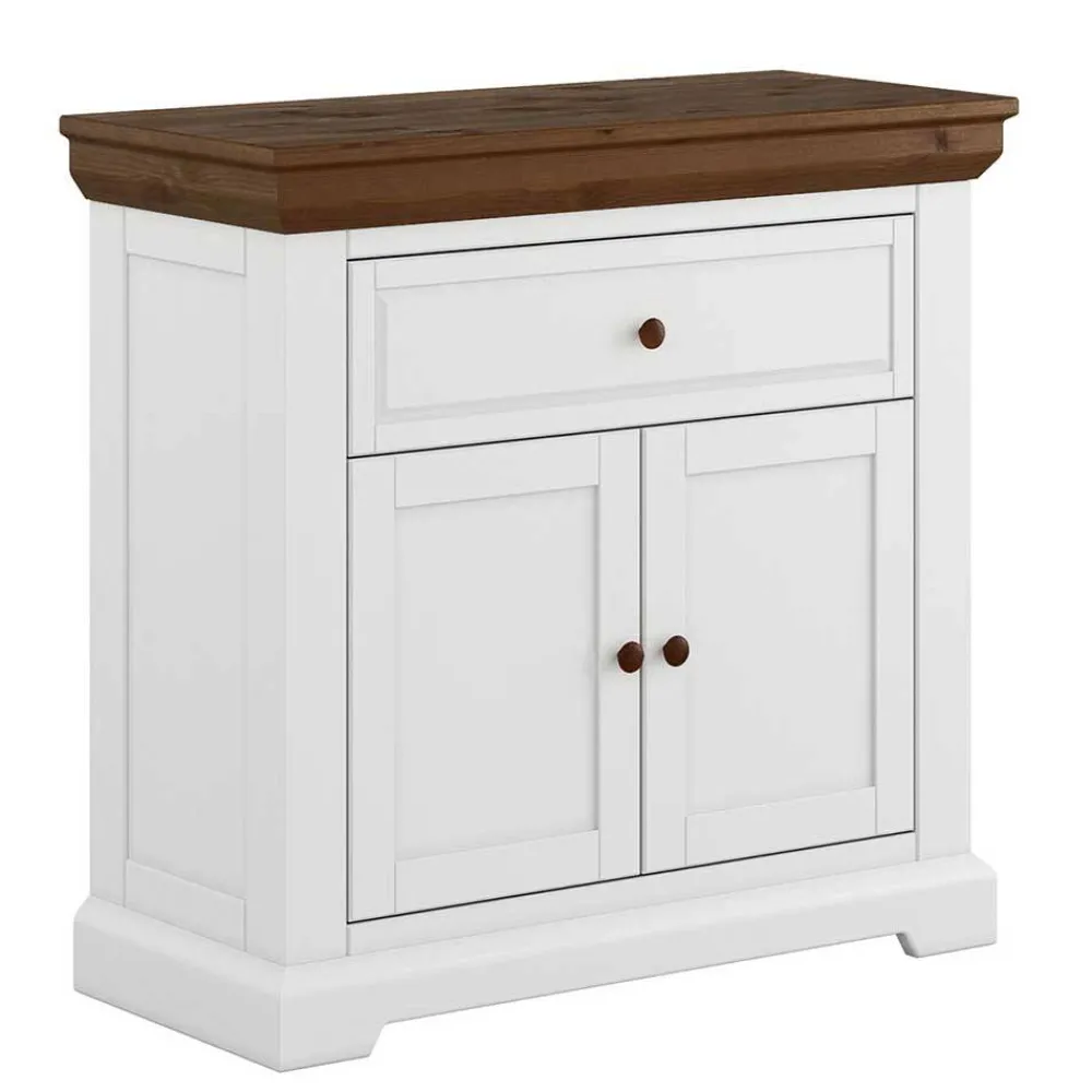Die Kommode „Zalya“ wird aus robustem Kiefernholz gefertigt, das für seine natürliche Schönheit und Langlebigkeit bekannt ist. Die Oberfläche ist weiß lackiert, wobei die Maserung des Holzes dezent durchschimmert und für eine authentische Optik sorgt. Die braunen Elemente wurden sorgfältig gebeizt und lackiert, wodurch eine edle Kontrasterstellung zu den weißen Flächen entsteht. Das Holz ist nicht nur ein optisches Highlight, sondern auch besonders pflegeleicht und sorgt für eine angenehme Haptik. Der Einlegeboden im Inneren ist aus Holzwerkstoff, genauso wie der Schubladenboden, während die Rückwand aus robustem Material besteht. Die rund gearbeiteten Holzknopfgriffe ergänzen das Gesamtbild und verleihen der Kommode eine charmante, rustikale Note.