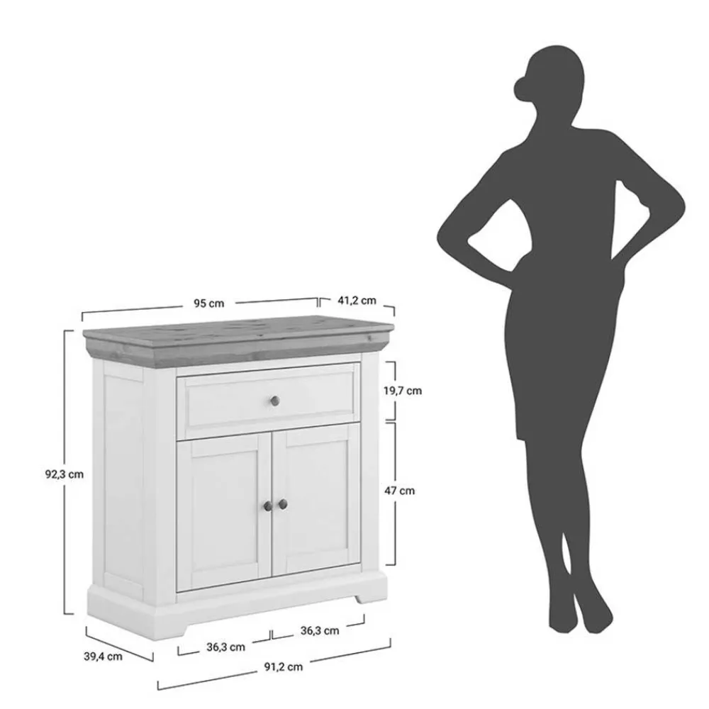 Verleihen Sie Ihrem Wohnraum eine einladende Atmosphäre mit der bezaubernden Landhaus-Kommode „Zalya“. Die harmonische Kombination aus Weiß und Braun setzt stilvolle Akzente in Ihrem Zuhause. Ihre großzügige Breite von 95 cm, eine Höhe von 93 cm und eine Tiefe von 42 cm bieten ausreichend Stauraum für Ihre Utensilien, während sie gleichzeitig im Landhausstil für ein warmes, gemütliches Ambiente sorgt. Gefertigt aus massivem Kiefernholz, begeistert diese Kommode durch ihre hochwertige Verarbeitung und das durchdachte Design. „Zalya“ passt perfekt in jedes Wohnzimmer, Schlafzimmer oder Flur und fügt sich harmonisch in zahlreiche Einrichtungsstile ein.