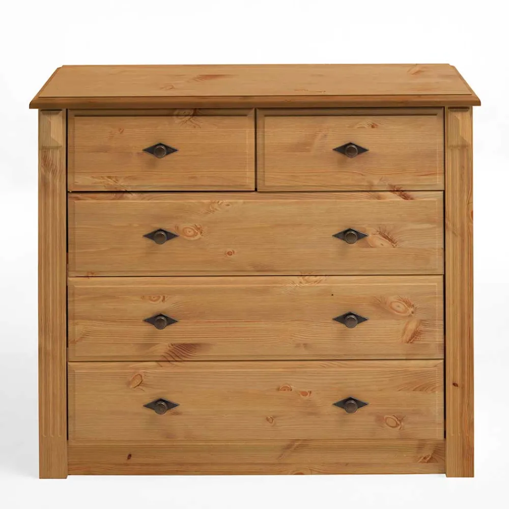 Mit einer Breite von 101 cm, einer Höhe von 87 cm und einer Tiefe von 48 cm bietet „Cabressan“ viel Stauraum. Die Kommode verfügt über zwei kleine und drei große Schubladen, die mit hochwertigen Metallauszügen ausgestattet sind. Diese sorgen für eine leichte und geräuscharme Bedienung. Die elegant gefräste Oberplatte und das reliefartige Design an der Frontseite verleihen der Kommode zusätzlichen Charme.