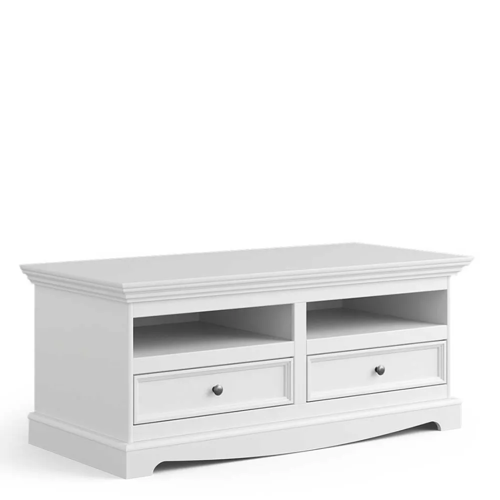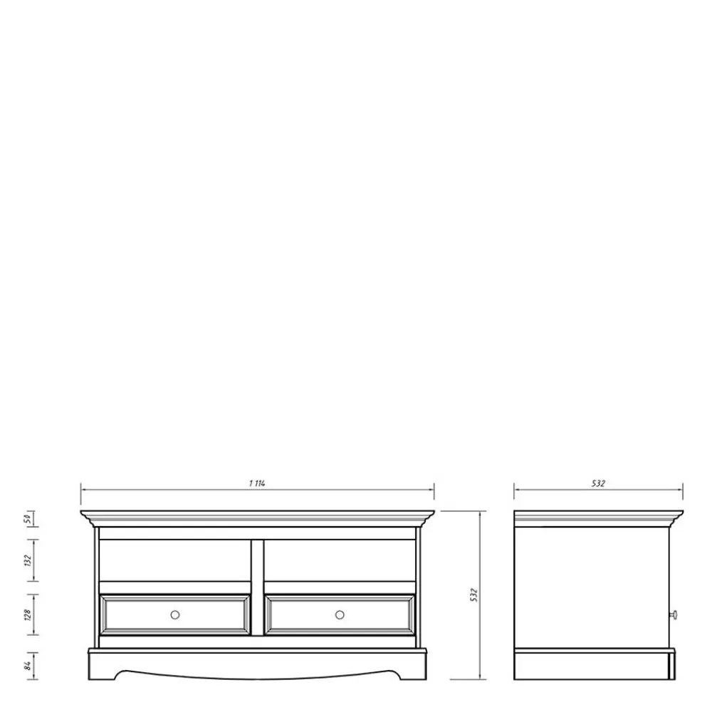 Mit Maßen von 111 cm Breite, 53 cm Höhe und 53 cm Tiefe bietet dieses Lowboard übersichtlichen Stauraum. Zwei offene Gerätefächer und zwei Schubladen mit Metallauszug und Soft Close Funktion – für ein sanftes und leises Schließen – bieten praktischen Stauraum. Die runden Metall-Knopfgriffe in Altsilberfarben fügen sich harmonisch in das Gesamtbild ein.