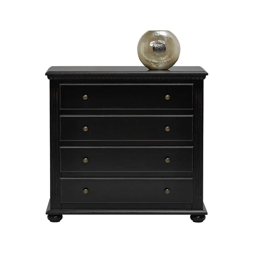 Die durchscheinende Holzmaserung und die handwerklich attraktiven Fräsungen machen jede Kommode zum Unikat. Diese Detailverliebtheit zeigt sich auch in den fein gearbeiteten, kleinen Knopfgriffen aus Metall im Antik-Design, die nicht nur optisch beeindrucken, sondern auch haptisch ein Erlebnis bieten. Mit einer Breite von 95 cm und einer Höhe von 90 cm bietet „Mamaia“ vier großzügige Schubladen, die reichlich Platz für Ihre Wohntextilien, Kleidungsstücke oder andere persönliche Gegenstände bieten.