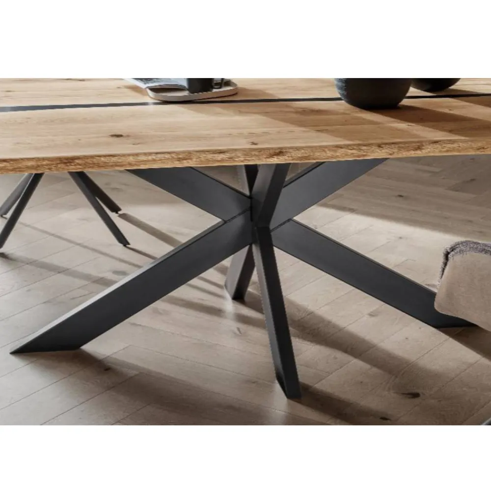 Sein stabiles Spidergestell aus Metall bildet einen kraftvollen Kontrast zur warmen Ausstrahlung der Wildeiche. Die schwarze Pulverbeschichtung sorgt für eine edle, matte Optik und macht das Gestell widerstandsfähig gegenüber äußeren Einflüssen. Die Verbindung aus massivem Holz und robustem Metall ergibt einen modernen Look mit industriellem Einschlag, der Ihrem Esszimmer ein stilsicheres Ambiente verleiht.