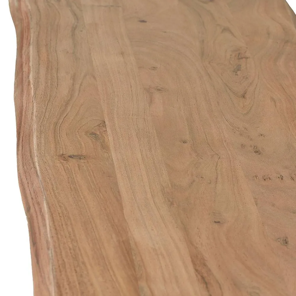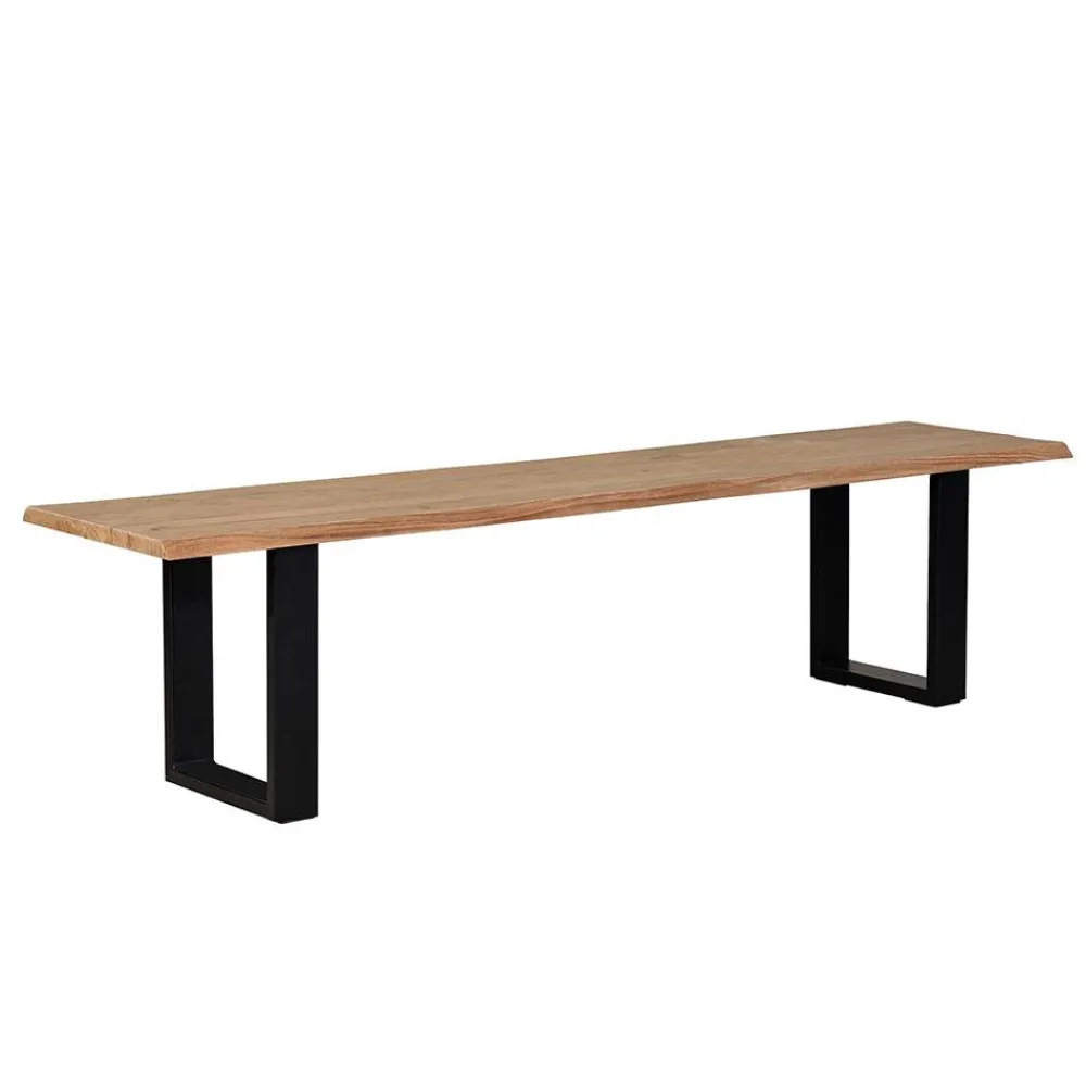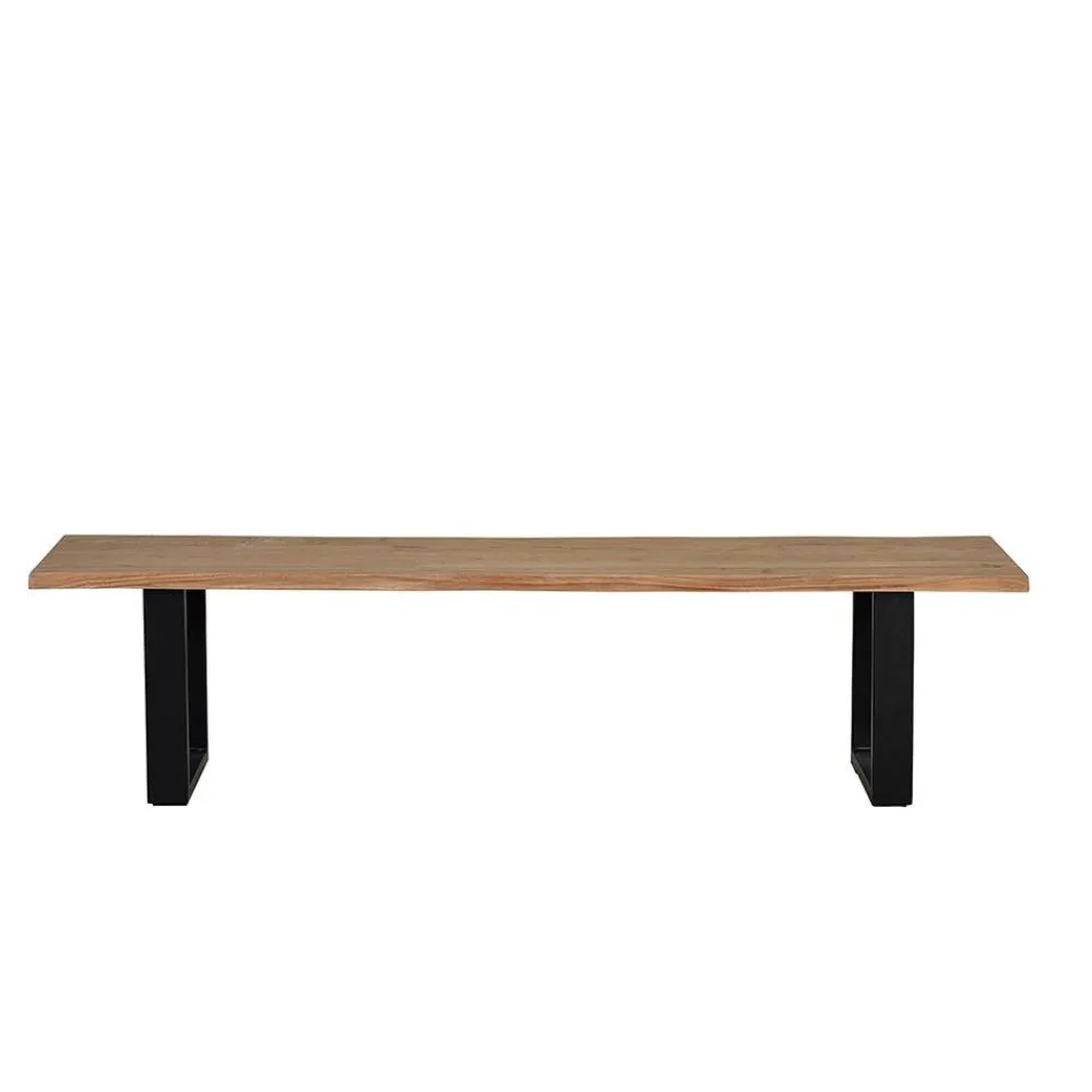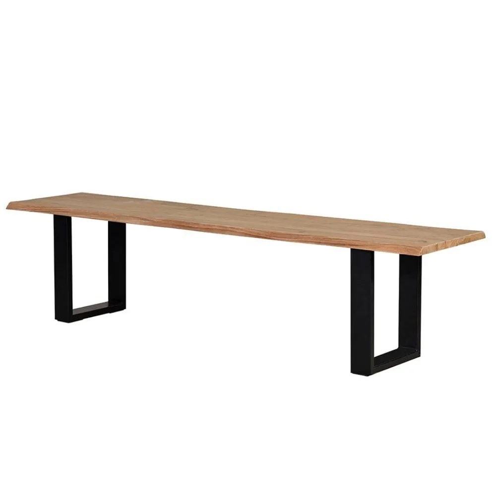 Gefertigt wird die „Calivia“ aus hochwertiger Akazie Massivholz und stabilem Metall. Das Sitzbrett überzeugt durch seine natürliche Maserung und die charakteristischen Baumkanten, die aus dem gewachsenen Stamm herausgeschnitten werden. Dadurch entsteht ein lebendiges, unverwechselbares Erscheinungsbild – jede Bank ist ein handgefertigtes Unikat. Die beiden U-Bügelbeine aus schwarzem Metall sorgen für einen sicheren, stabilen Stand und setzen einen modernen Kontrast zum warmen Holzton.