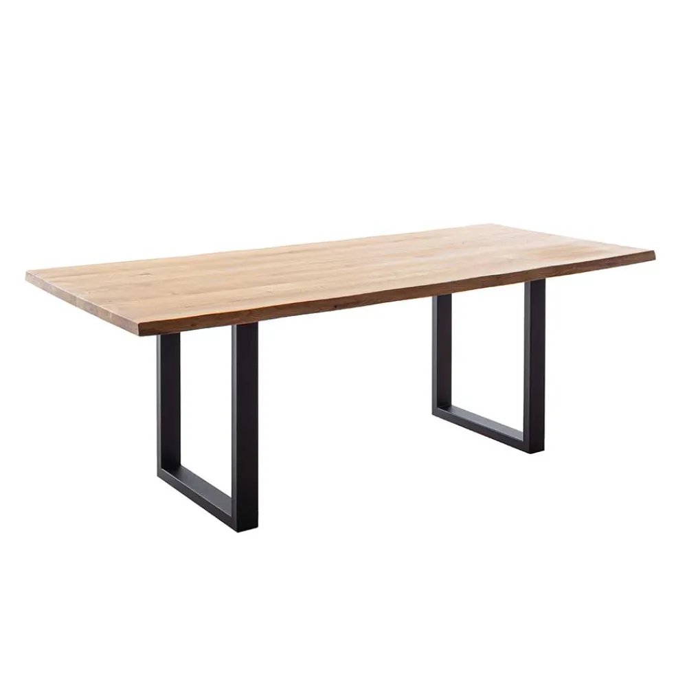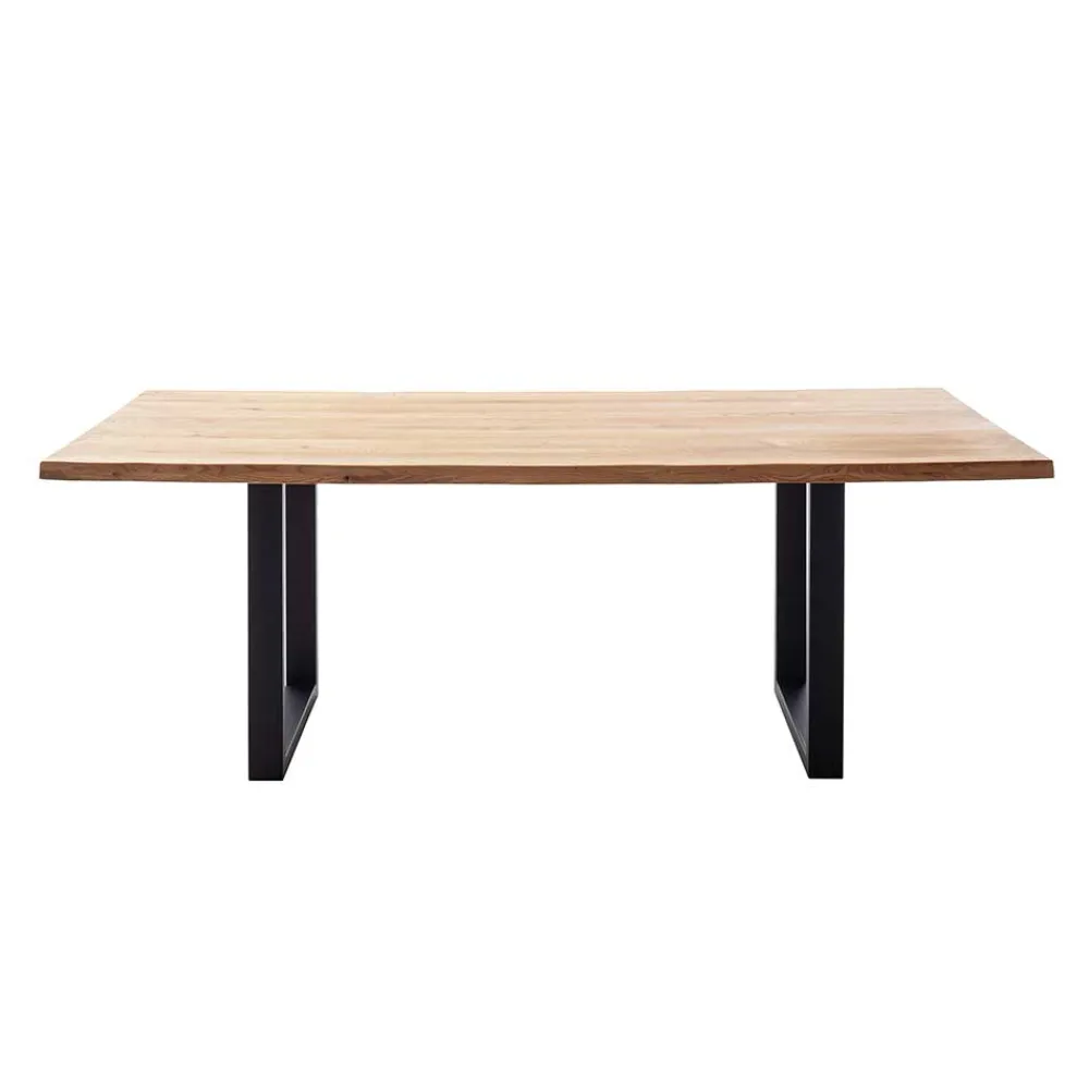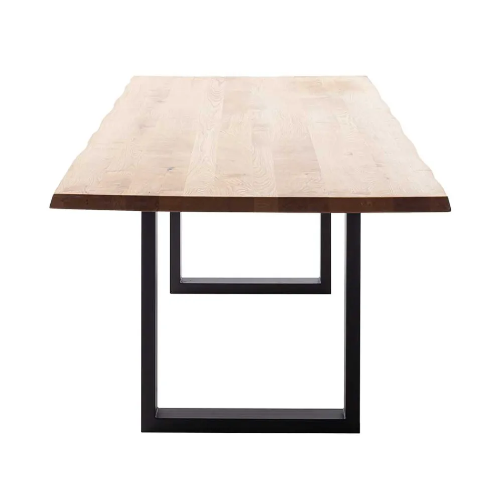 Gefertigt aus hochwertigem Wildeiche Massivholz, das durchgehende Lamellen aufweist, garantiert dieser Tisch nicht nur Langlebigkeit, sondern auch ein einzigartiges Design. Die natürliche Holzoberfläche ist sorgfältig geölt, was die Schönheit des Materials noch verstärkt und gleichzeitig vor äußeren Einflüssen schützt. Die spezielle Baumkante macht jedes Stück zu einem Unikat – direkt aus dem Stamm geschnitten, zeigt der Tisch, wie das Holz gewachsen ist. In Kombination mit dem pulverbeschichteten, schwarzen Bügelgestell aus Metall entsteht ein harmonisches Zusammenspiel aus Holz und Metall, das für Stabilität sorgt und zugleich einen modernen Akzent setzt.