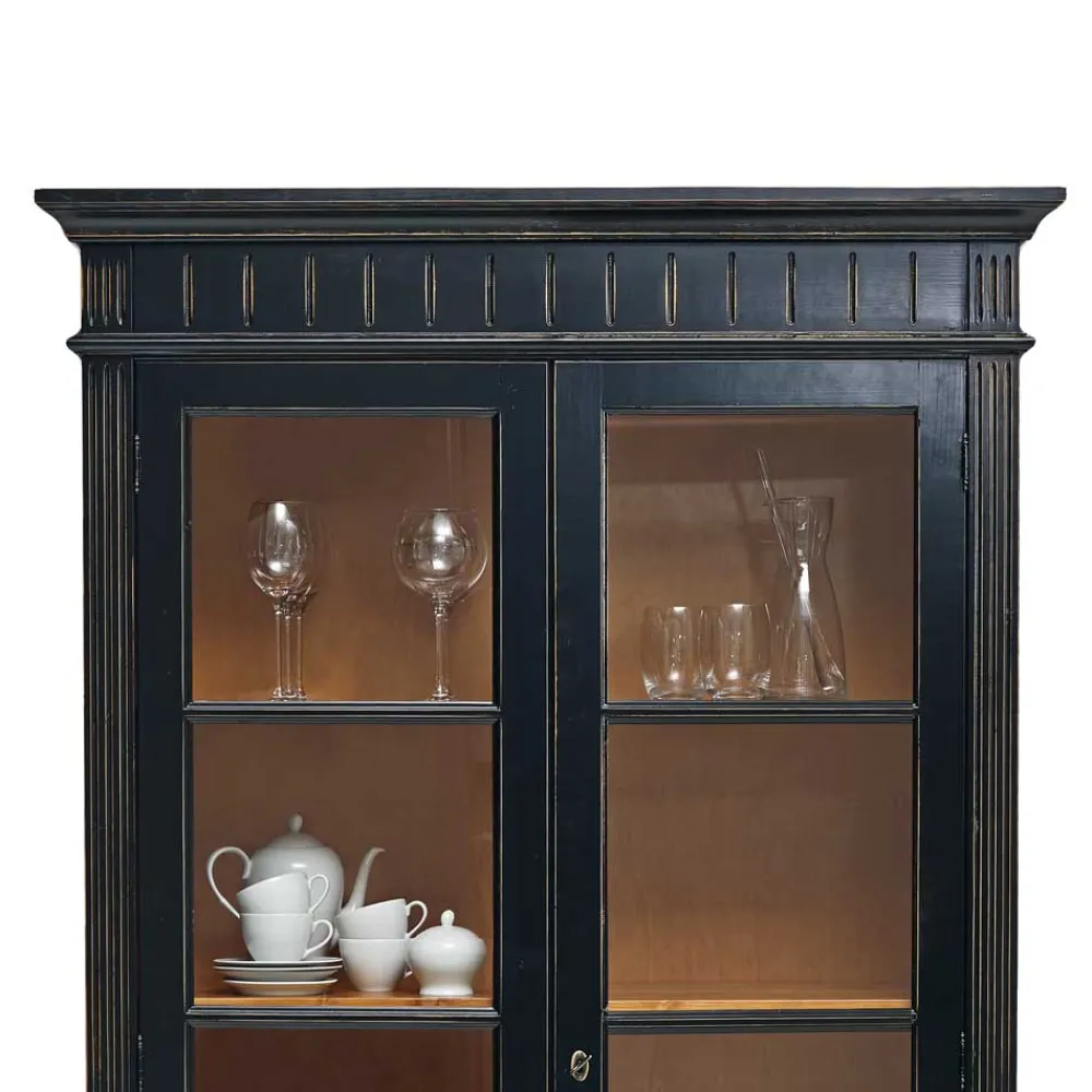 Mit viel Liebe zum Detail von Hand in Schwarz lackiert, verleiht der exklusive Velvet-Lack der Vitrine „Zanyorita“ eine einzigartig samtig-weiche Oberfläche. Diese spezielle Lackierung bietet nicht nur einen visuellen Mehrwert, sondern schützt das Holz auch vor Abnutzung und betont seine natürliche Schönheit. Die samtige Haptik lädt dazu ein, die Oberfläche zu berühren und die exzellente Verarbeitungsqualität selbst zu fühlen.