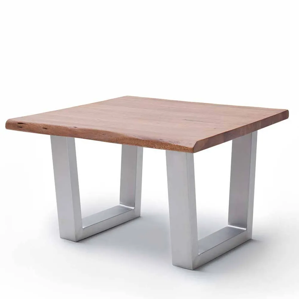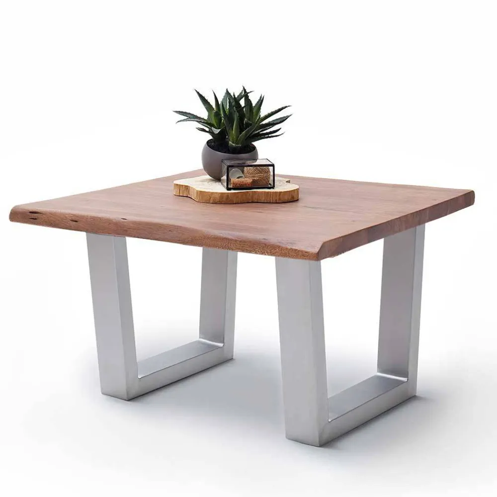 Getragen wird die edle Tischplatte von einem stabilen Metall-Bügelgestell aus gebürstetem Edelstahl. Die trapezförmige U-Form bietet nicht nur einen sicheren Stand, sondern setzt auch einen modernen Akzent, der den industriellen Look des Tisches gekonnt abrundet. Mit einer maximalen Belastbarkeit von 30 kg ist dieser Tisch ideal für alles, was Sie im Wohnzimmer griffbereit haben möchten – ob Bücher, Deko oder ein Tablett mit Drinks für Ihre Gäste.