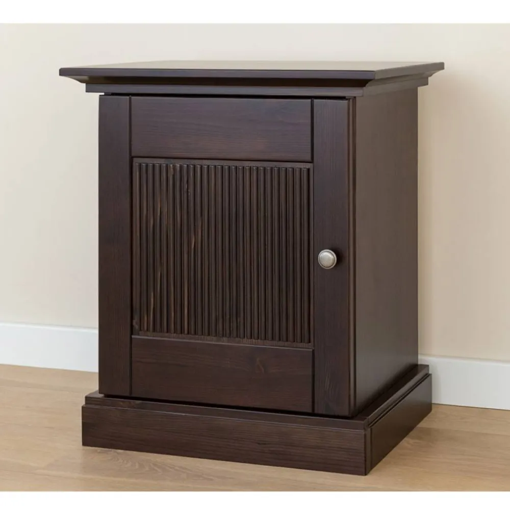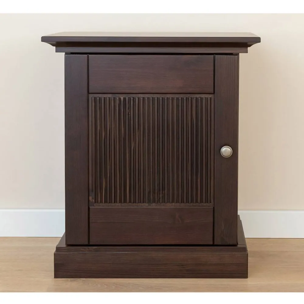 Ein besonderes Highlight ist die formschöne, leicht überstehende Deckplatte mit elegantem Profil. Die Front der Tür zeigt dekorative Rillenfräsungen, die dem Nachtschrank eine dezente Struktur verleihen. Die Tür ist mit hochwertigen Soft-Close-Beschlägen aus Metall ausgestattet und schließt dadurch angenehm leise. Der Innenraum wird durch einen verstellbaren Einlegeboden in zwei praktische Fächer unterteilt – perfekt, um persönliche Dinge ordentlich zu verstauen. Ein schlicht-charmanter Knopfgriff aus Metall in Altsilber setzt dabei einen harmonischen Akzent.