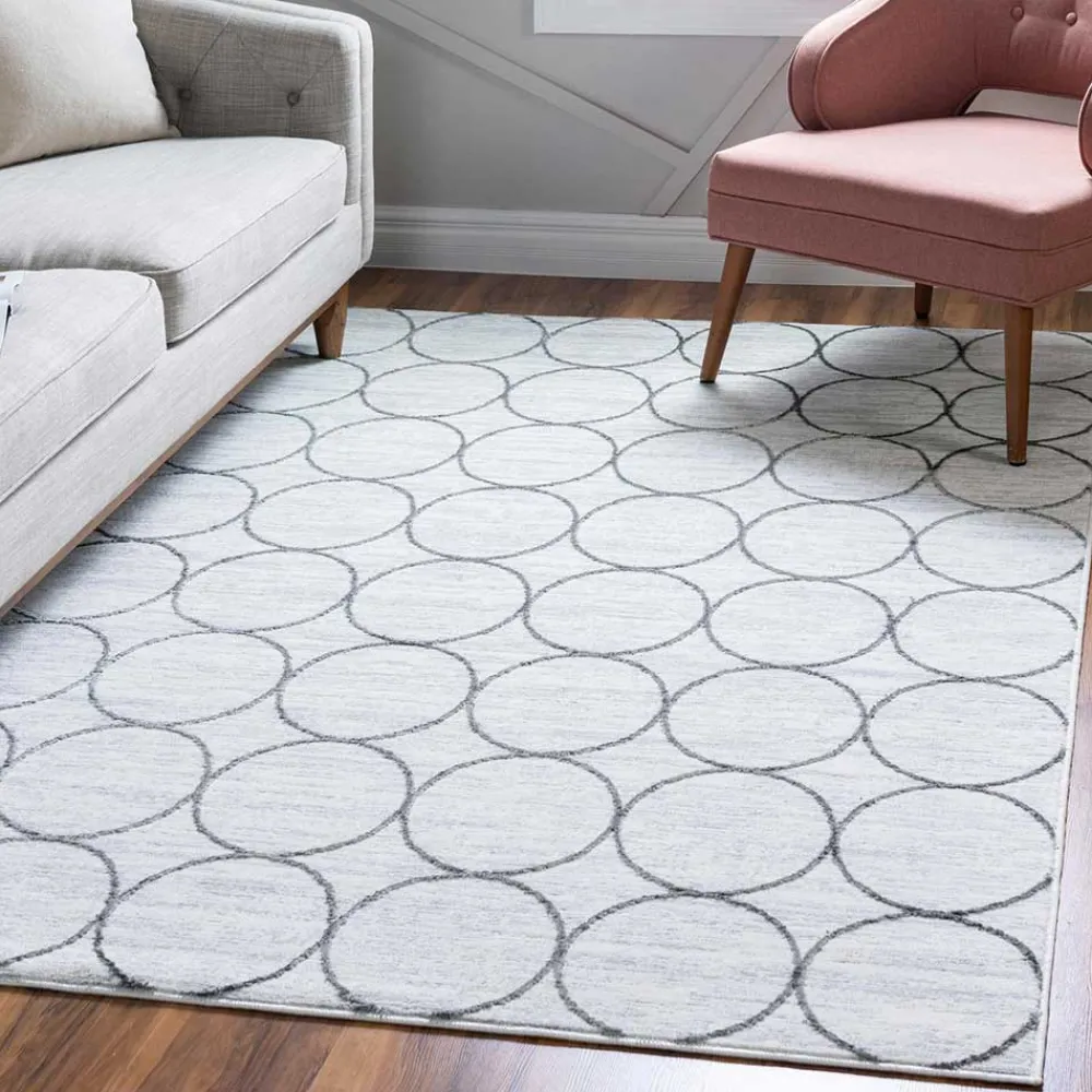 Mit seinem klaren Design und der dezenten Farbgebung bringt der moderne Teppich „Jelsica“ stilvolle Ruhe in Ihre Wohnräume. Die Kombination aus sanftem Cremeweiß und kühlem Grau wirkt zurückhaltend und dennoch charakterstark – ideal für minimalistische Einrichtungen, urbane Lofts oder als ruhiger Kontrast in farbenfrohen Interieurs. Die geometrische Musterung aus Kreisen verleiht dem Teppich „Jelsica“ eine dynamische Note, ohne sich in den Vordergrund zu drängen.