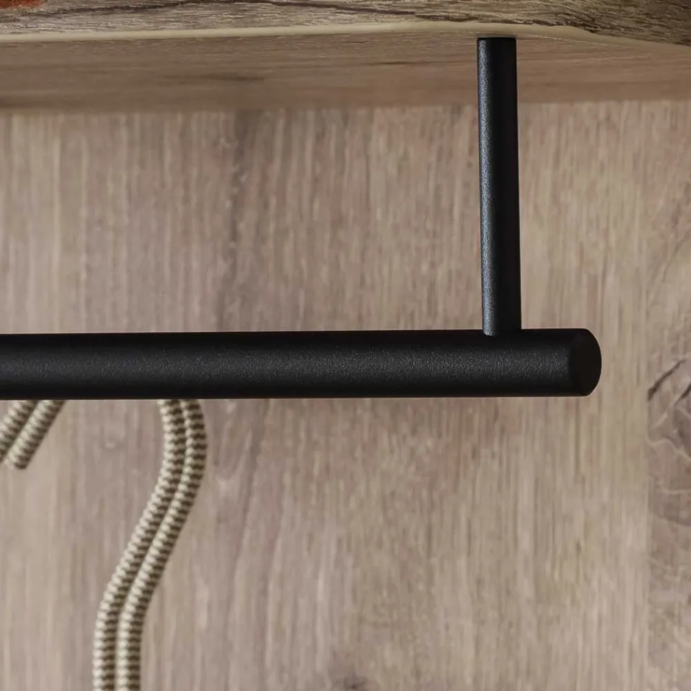 Dieses Garderobenpaneel bietet nicht nur optische Highlights, sondern auch eine durchdachte Funktionalität. Die stabile Hutablage mit einer großzügigen Breite von 41,8 cm bietet Platz für Mützen, Schals oder kleine Taschen. Direkt darunter befindet sich eine Metall-Kleiderstange in stilvollem Anthrazit, an der Jacken und Mäntel ordentlich aufgehängt werden können. Zwei zusätzliche Haken mit Abrutschschutz ermöglichen das bequeme Aufhängen von Taschen oder Accessoires – ideal für den schnellen Zugriff im Alltag.