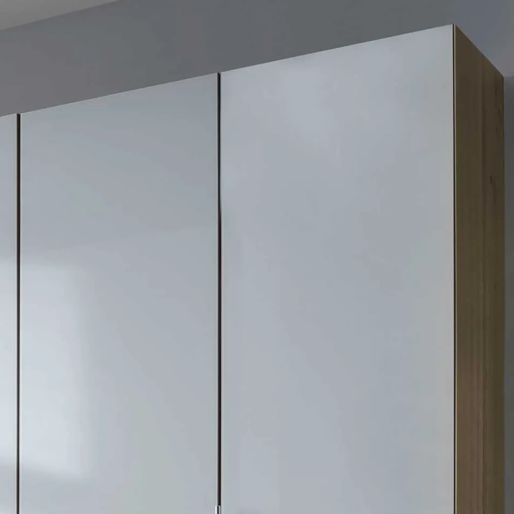 Die Fronten stechen besonders hervor: Beschichtet mit weißem Glas, verleihen sie den Möbeln eine luxuriöse Ausstrahlung und eine glatte, pflegeleichte Oberfläche. Diese Kombination aus der Holzoptik und der Glasbeschichtung kreiert einen ansprechenden Kontrast, der das Set zum Mittelpunkt Ihres Schlafzimmers macht.
