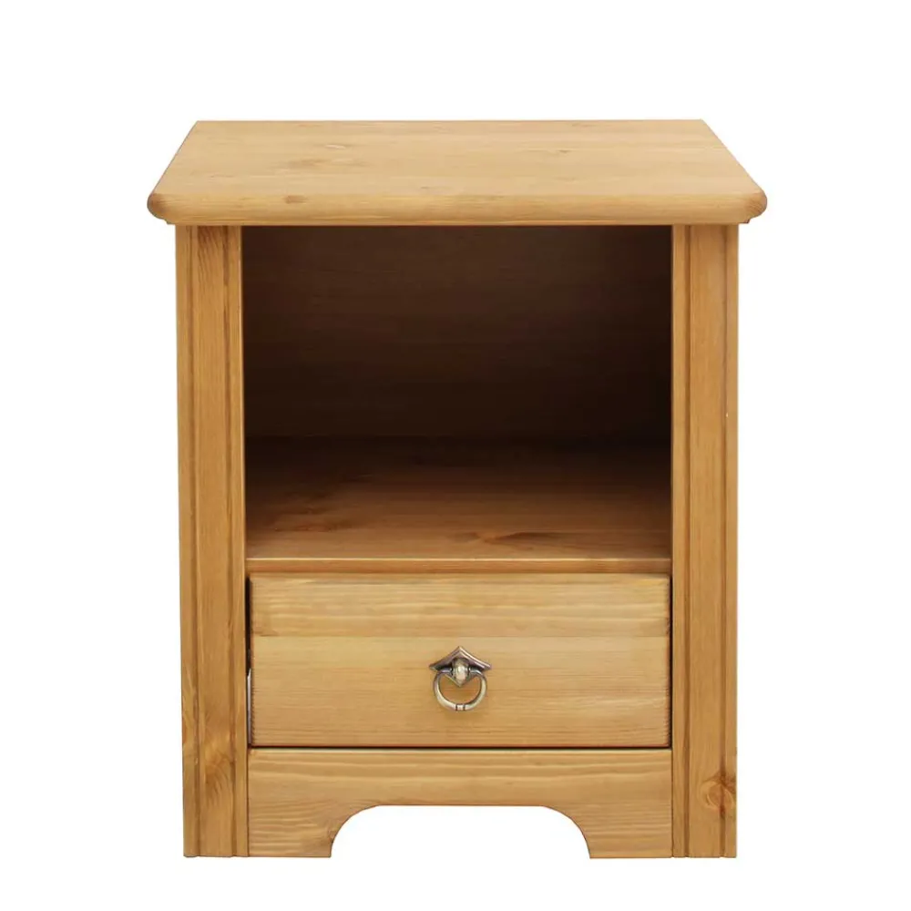 Zusammen mit dem Landhaus Holzbett Imressa erhalten Sie hier bei Wohnen.de auch gleich zwei passende Nachttische im Set-Angebot. Diese sind ebenfalls aus massivem Kiefernholz mit geölten Oberflächen mit den Abmessungen ca. 45x50x38 cm gefertigt. Jeder Nachttisch bietet ein offenes Fach und eine Schublade mit einem Metallgriff im Ring-Design.