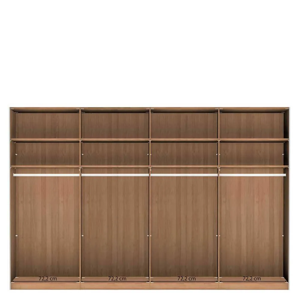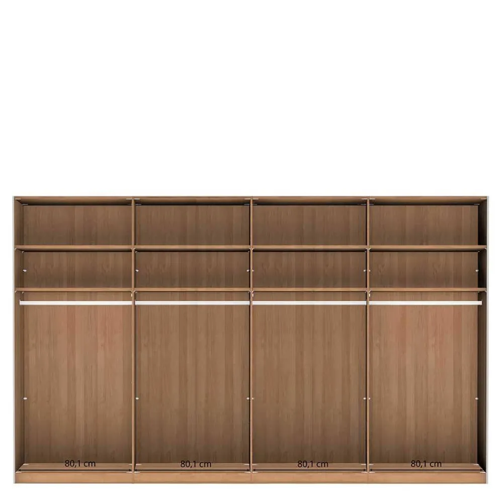 Die vier Schwebetüren mit Synchron-Öffnung ermöglichen ein leichtes und synchrones Öffnen und Schließen der Türen, ideal für Räume mit begrenztem Platzangebot. Die äußeren beiden Türfronten bestehen aus massivem Eichenholz, während die mittleren beiden Türfronten mit stilvollem, dunkelbraunem Glas beschichtet sind. Die langen Metallgriffleisten in Korpusfarbe unterstreichen das moderne Design und erleichtern die Handhabung.