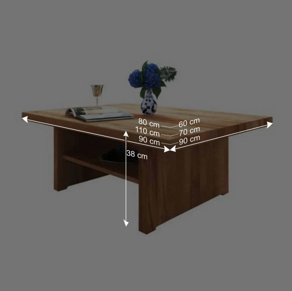 Der Wohnzimmertisch „Salomonia“ bietet Ihnen Flexibilität in den Maßen: Wählen Sie zwischen einer Breite von 80 cm, 90 cm oder 110 cm und einer Tiefe von 60 cm, 70 cm oder 90 cm. Mit einer Höhe von 38 cm passt er sich perfekt jeder Wohnzimmerumgebung an. Die rechteckige bzw. quadratische Tischform und die starke, ca. 40 mm dicke Tischplatte bieten ausreichend Platz für Ihre Wohnzimmerutensilien. Zusätzlichen Stauraum bietet die praktische Ablagefläche unter der Tischplatte.