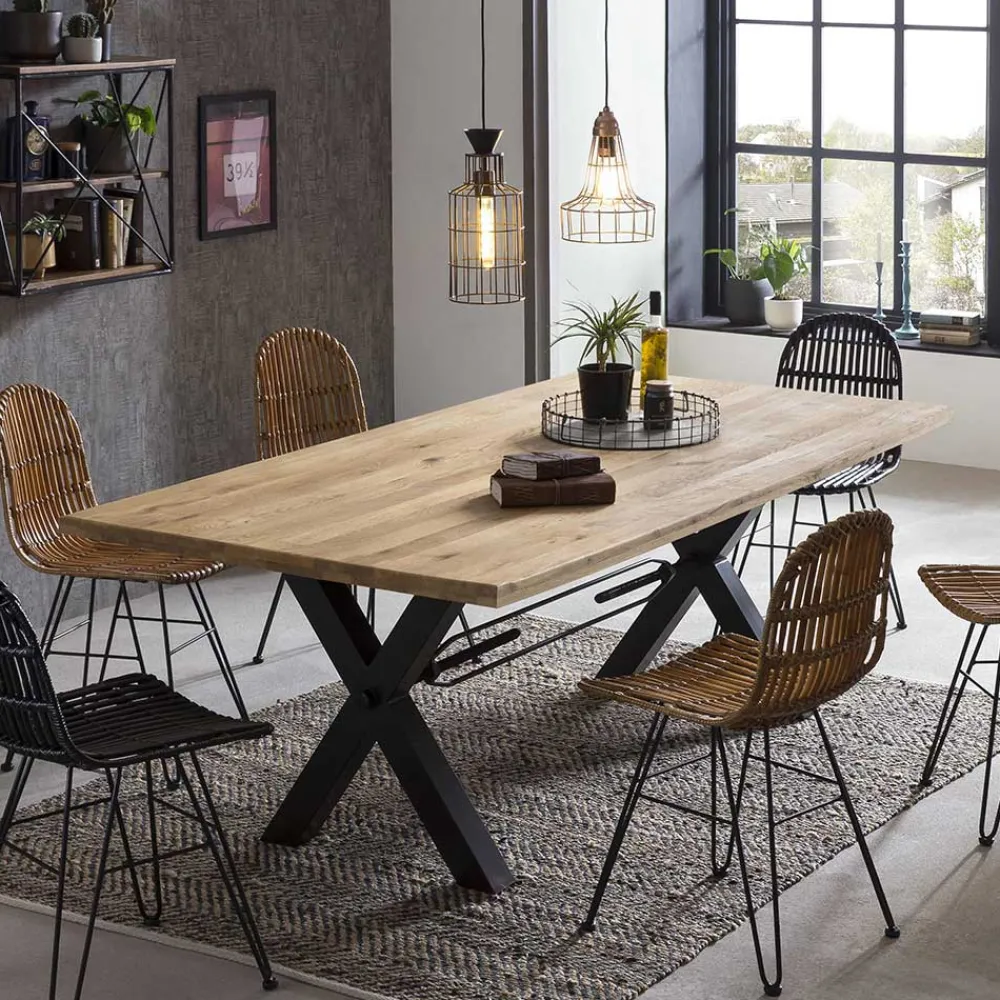 Der Esstisch besteht aus massivem Wildeicheholz und Metall und besticht durch seine authentisch lebhafte Maserung sowie seine einzigartigen Baumkanten. Jedes Stück ist ein Unikat und aus dem Stamm geschnitten, wie er gewachsen ist. Dadurch können Abweichungen von mehreren Zentimetern sowie Wuchsrisse, Astlöcher und Dellen auftreten, die den individuellen Look dieses Naturproduktes unterstreichen. Die solide Plattenstärke von bis zu ca. 4 cm und das kantige, in Schwarz lackierte Metallgestell in stabiler X-Form sorgen für Stabilität und hervorragende Qualität von hoher Lebensdauer.
