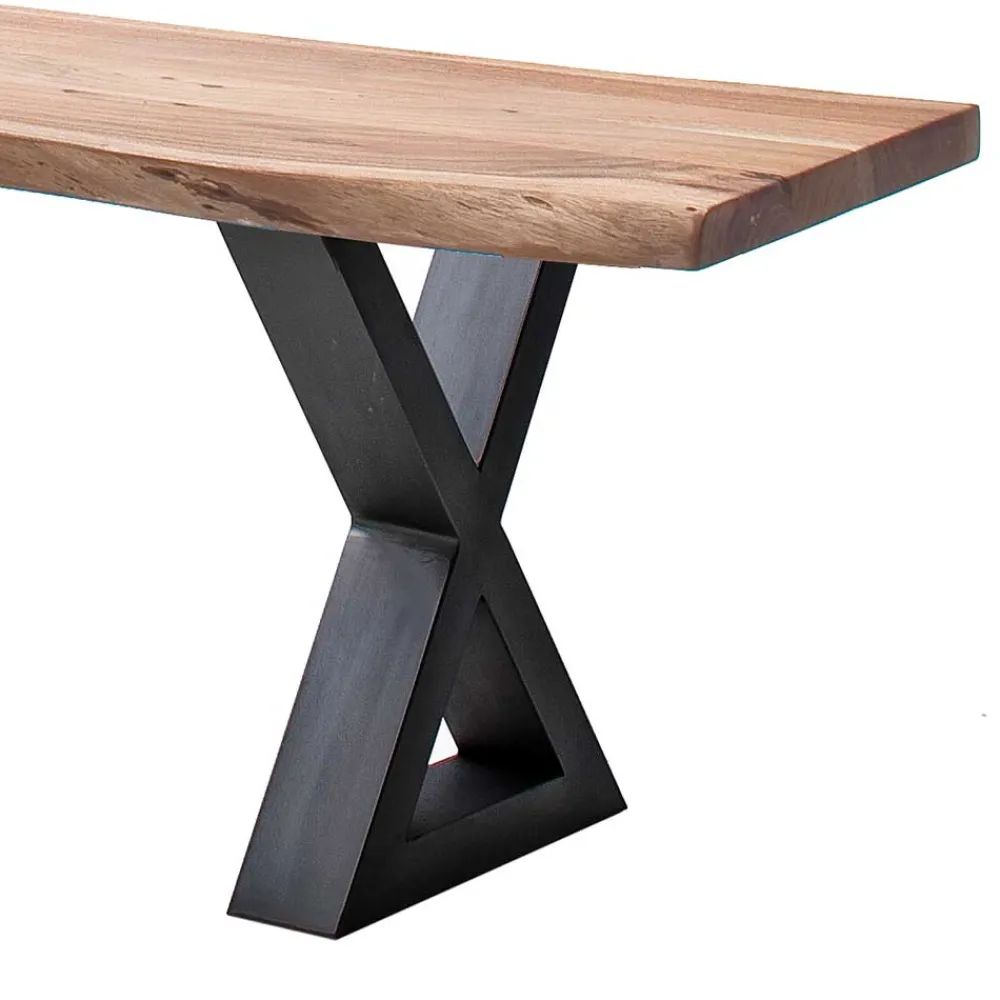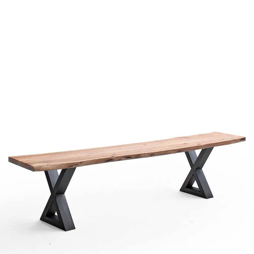 Die Bank ruht auf stylischen X-Beinen aus Metall, die in Anthrazit lackiert sind. Die breite, durchgehende Bodenauflage der Beine sorgt für optimale Stabilität und unterstreicht den industriellen Look der Bank. Diese Kombination aus rustikalem Holz und modernem Metall verleiht der „Coriba“ ihren einzigartigen Charme.