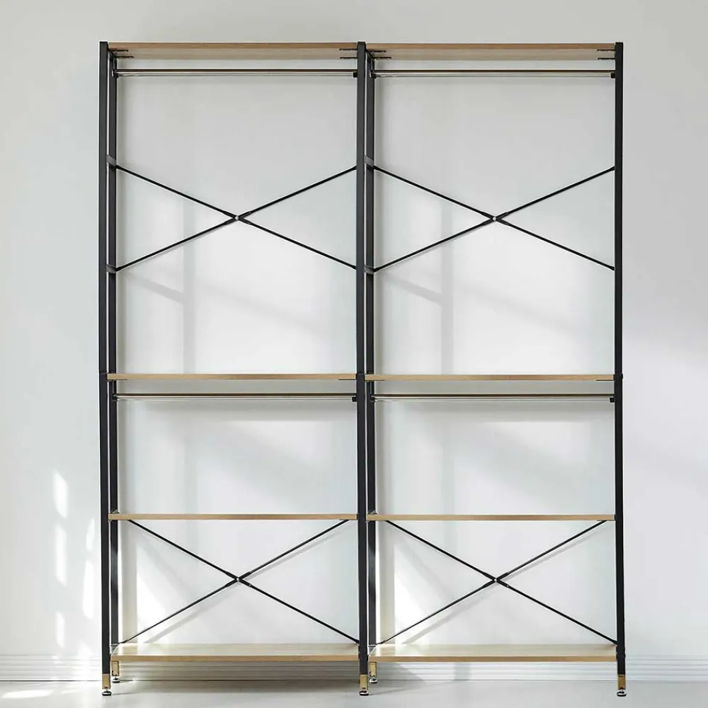 Mit einer Breite von 168 cm, einer Höhe von 210 cm und einer Tiefe von 30 cm bietet das Garderobenregal „Catuella“ viel Stauraum in einer übersichtlichen und offenen Einteilung. Jedes der beiden Elemente misst 85x210x30 cm und enthält vier stabile Einlegeböden und zwei Kleiderstangen aus Metall. Die oberen Böden können zudem als Hutablage genutzt werden.