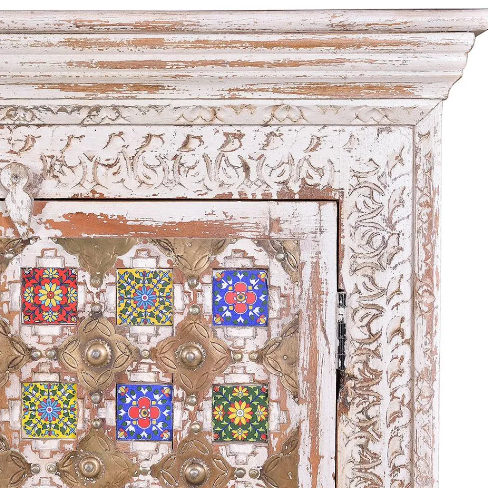 Der Schrank „Mirell“ besteht aus langlebigem Mangobaum Massivholz, dessen Oberflächen mit einem edlen White-Wash-Effekt behandelt wurden, um den typischen Shabby Chic Charme zu unterstreichen. Das massive Holzsockelgestell sorgt für Stabilität und eine zeitlose Optik. Die bronzefarbenen Ringgriffe und Beschläge aus Metall setzen stilvolle Akzente, während die liebevoll gestalteten Keramikfliesen die Fronten zieren und für einen Hauch von Farbe und Lebendigkeit sorgen. Die Deckplatte und der Sockel sind mit fein gefrästen Kanten versehen und betonen die handwerkliche Verarbeitung dieses besonderen Möbels.