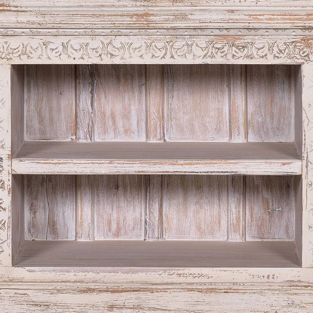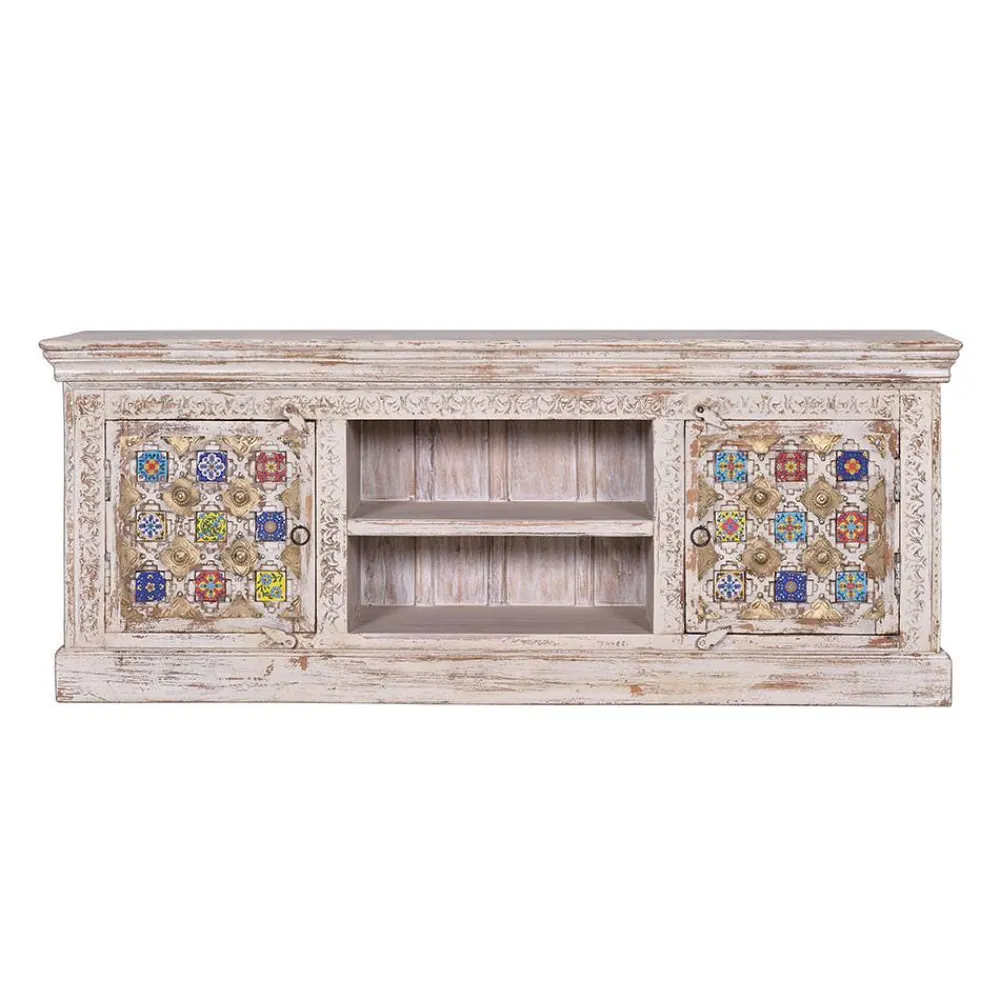 Gefertigt aus massivem Mangobaumholz, strahlt die „Mirell“ nicht nur Qualität aus, sondern ist auch ein echter Hingucker. Die Holzoberflächen sind behutsam mit einem White Wash Effekt behandelt, wodurch die natürliche Maserung des Holzes wunderbar zur Geltung kommt. Verziert mit hübschen Keramikfliesen, die florale Ornamente präsentieren, unterstreicht dieses TV Lowboard die Liebe zum Detail. Die bronzefarbigen Ringgriffe und Beschläge aus Metall fügen sich perfekt in das Gesamtbild ein und sorgen für eine nostalgische Note. Die Deckplatte und der Sockel sind mit gefrästen Kanten versehen, was die Hochwertigkeit dieses Möbelstücks noch einmal betont. Durch die handwerkliche Fertigung ist jedes Lowboard ein Unikat mit eigenen Farbnuancen und Strukturen.