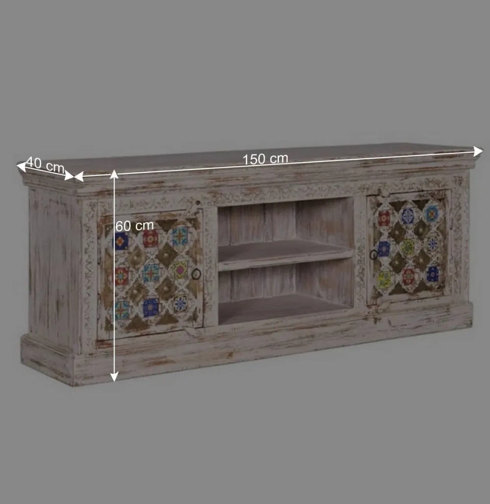 Willkommen in der charmanten Welt des Shabby Chic! Das TV Lowboard „Mirell“ begeistert mit seiner extravaganten Gestaltung in Antikweiß und bunten Akzenten. Dieses einzigartige Möbelstück ist nicht nur ein praktischer Stauraum für Ihr TV-Zubehör, sondern auch ein stilvoller Blickfang in Ihrem Wohnraum. Ob im Wohnzimmer oder im Heimkino, die „Mirell“ fügt sich harmonisch in jede Umgebung ein und belebt Ihr Interieur mit ihrem verspielten Charakter.