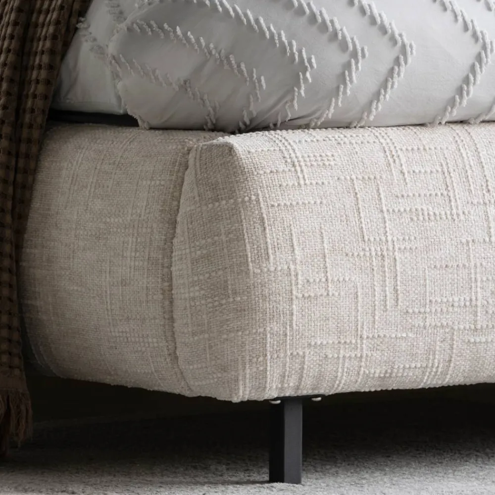 Das solide Bettgestell besteht aus einer stabilen Kombination von Massivholz und Spanplatte, sodass Sie auf eine verlässliche Konstruktion zählen können. Der Bezug aus strapazierfähigem Bouclé-Gewebe (100 % Polyester) fühlt sich angenehm an und punktet mit langlebig schöner Optik. Für sicheren Stand sorgen pulverbeschichtete Metallbeine in Schwarz, die mit ihrer schlanken Form dezent im Hintergrund bleiben und zugleich eine praktische Bodenfreiheit von 10 cm ermöglichen.