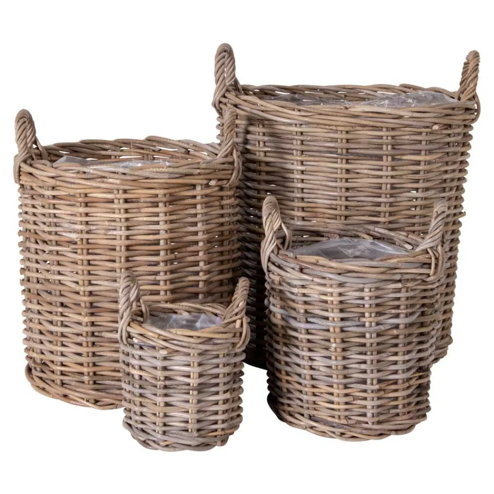 Das Set besteht aus vier Körben in folgenden Maßen: 50x58x50 cm, 40x48x40 cm, 30x38x30 cm und 20x28x20 cm (BxHxT). Diese unterschiedlichen Größen ermöglichen Ihnen, die Körbe vielseitig in Ihrem Zuhause einzusetzen – ob als Aufbewahrungslösungen, zur Dekoration oder als Pflanzengefäße für Innen- und Außenbereiche.