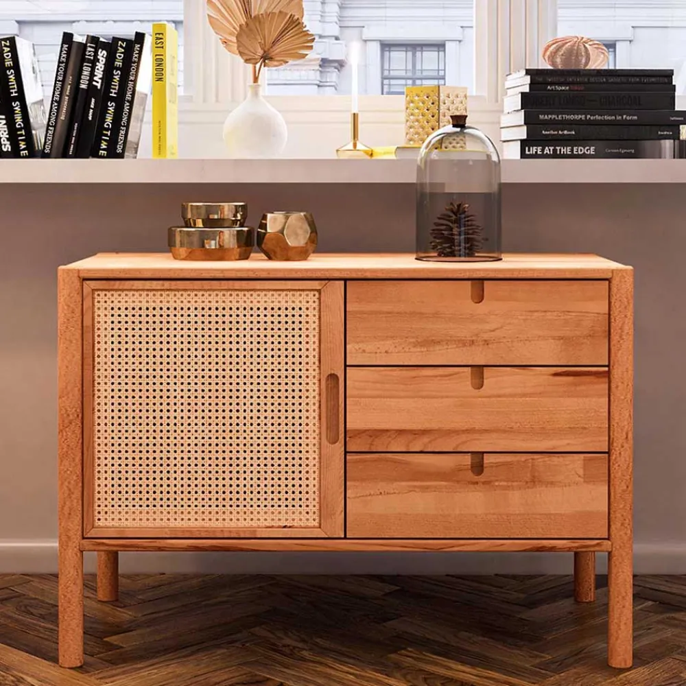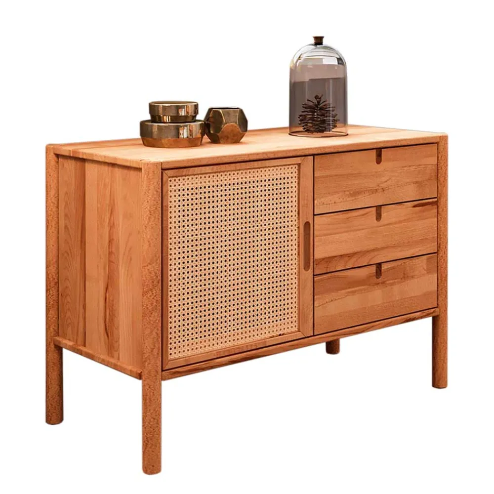Eleganz und Funktionalität vereinen sich in der Kommode „Indrya“, die durch ihr modernes, natürliches Design überzeugt. Das Highlight dieses Möbelstücks ist die harmonische Verbindung aus massiver Wildbuche und Rattan, die Ihrem Wohnraum eine warme und zeitgemäße Atmosphäre verleiht.