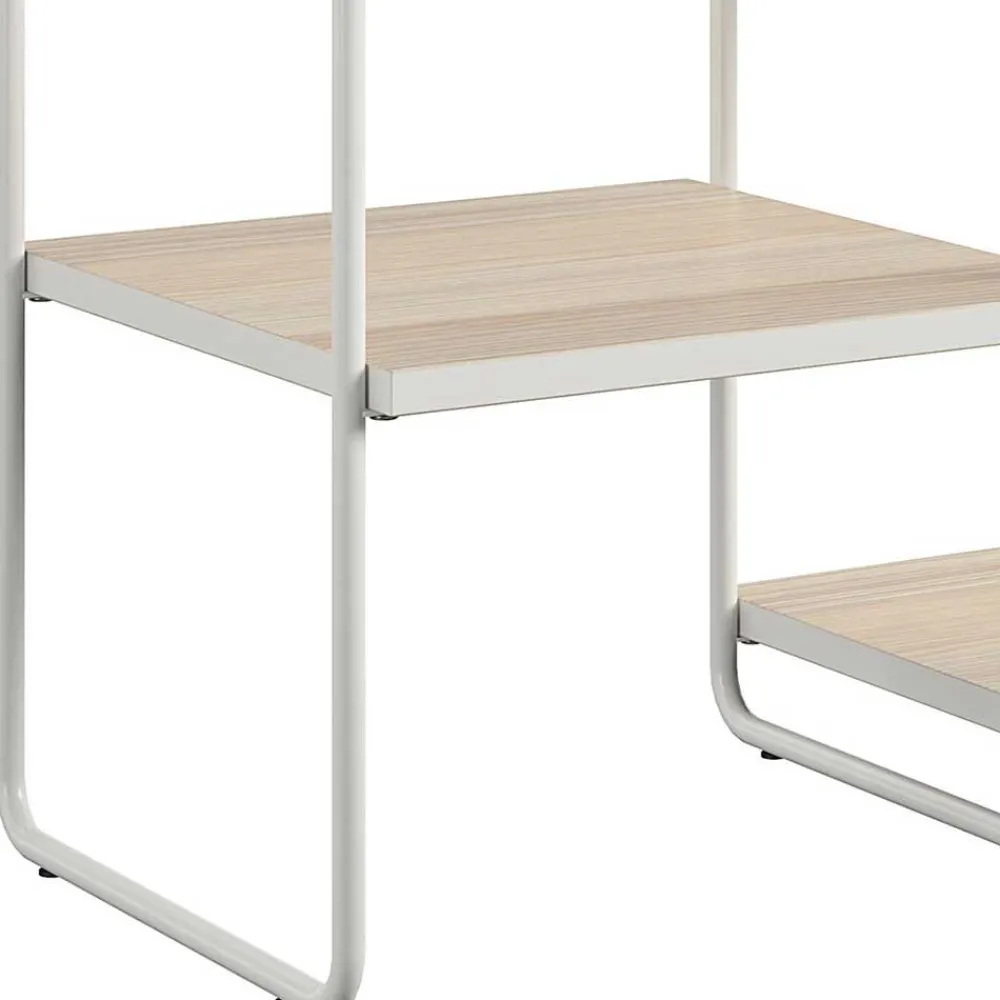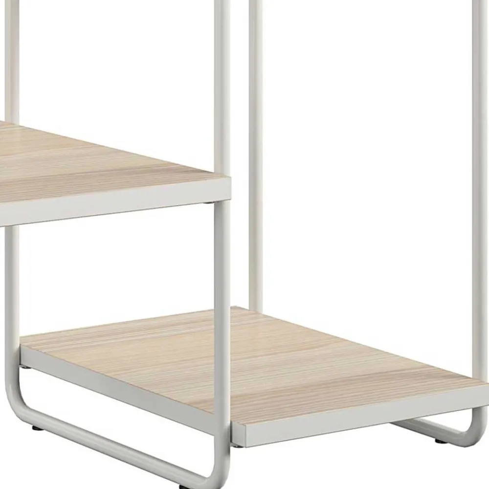 Der Blumenständer besteht aus hochwertigem Holzwerkstoff (MDF) und robustem Metall. Die Oberflächen in Holzoptik sind sorgfältig foliert, während die Tischplatten mit einem weißen Rand gestaltet sind. Die Bügelgestelle aus weiß pulverbeschichtetem Metall verleihen dem Möbelstück einen modernen Touch und gewährleisten zugleich Stabilität und Langlebigkeit.