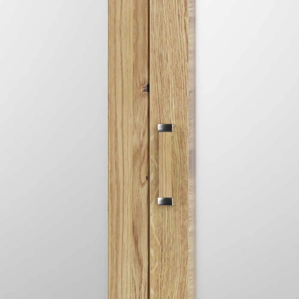 Im Inneren des Kleiderschranks finden Sie zwei große Facheinheiten und eine kleine Facheinheit. Jede Facheinheit ist mit einer Kleiderstange und zwei Einlegeböden ausgestattet, um Ihre Kleidung geordnet und griffbereit zu halten. Die dezente Kombination aus Holz- und Metallbügelgriffen fügt sich nahtlos in das Gesamtbild des Kleiderschranks ein und sorgt für eine harmonische Optik.