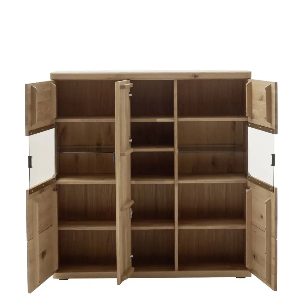 Die „Losiamos“ Schrankvitrine bietet mit vier verstellbaren Einlegeböden, zwei verstellbaren Glasböden und sechs festen Böden eine durchdachte Innenaufteilung für Ihre Gläser, Geschirr oder Dekoobjekte. Drei Drehtüren mit Soft-Close Funktion und gedämpften Metallbeschlägen ermöglichen komfortables und leises Schließen, während die Parsolglaseinsätze Ihre schönsten Stücke dezent präsentieren.