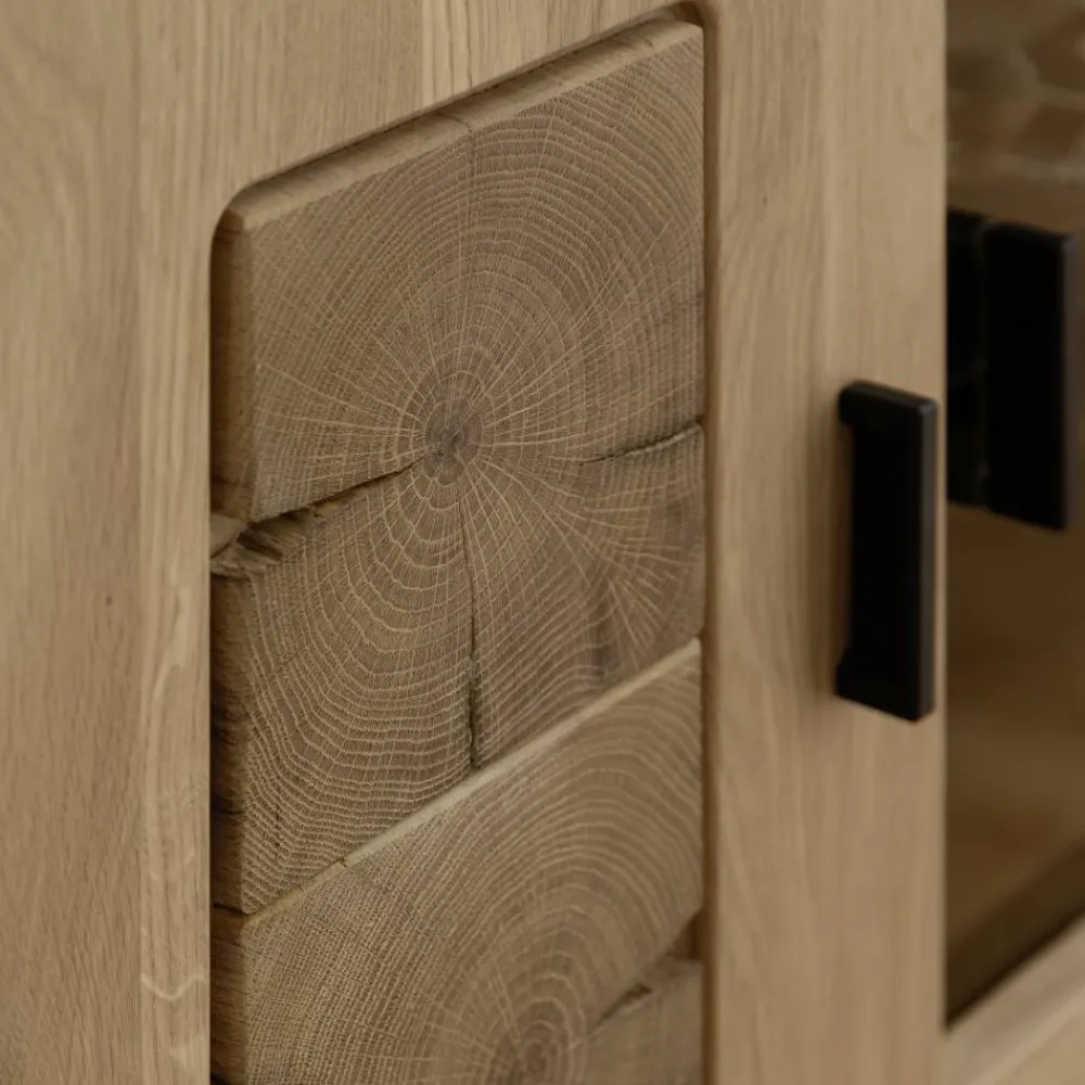 Die Schrankvitrine wird aus astigem Balkeneiche Massivholz gefertigt, dessen helle Oberfläche geölt ist und die lebendige Maserung des Holzes betont. Die Front ist aus durchgehender Lamelle gearbeitet, während der stabile Korpus in robuster Keilzinkung ausgeführt ist. Rückwände mit hellem Echtholzfurnier aus Asteiche werten auch den Innenraum optisch auf, während Parsolglaselemente über Eck den Türen eine elegante Transparenz verleihen. Das mittlere Front-Element wird von einer kunstvoll eingearbeiteten Hirnholzapplikation verziert und unterstreicht die natürliche Qualität des Möbelstücks.