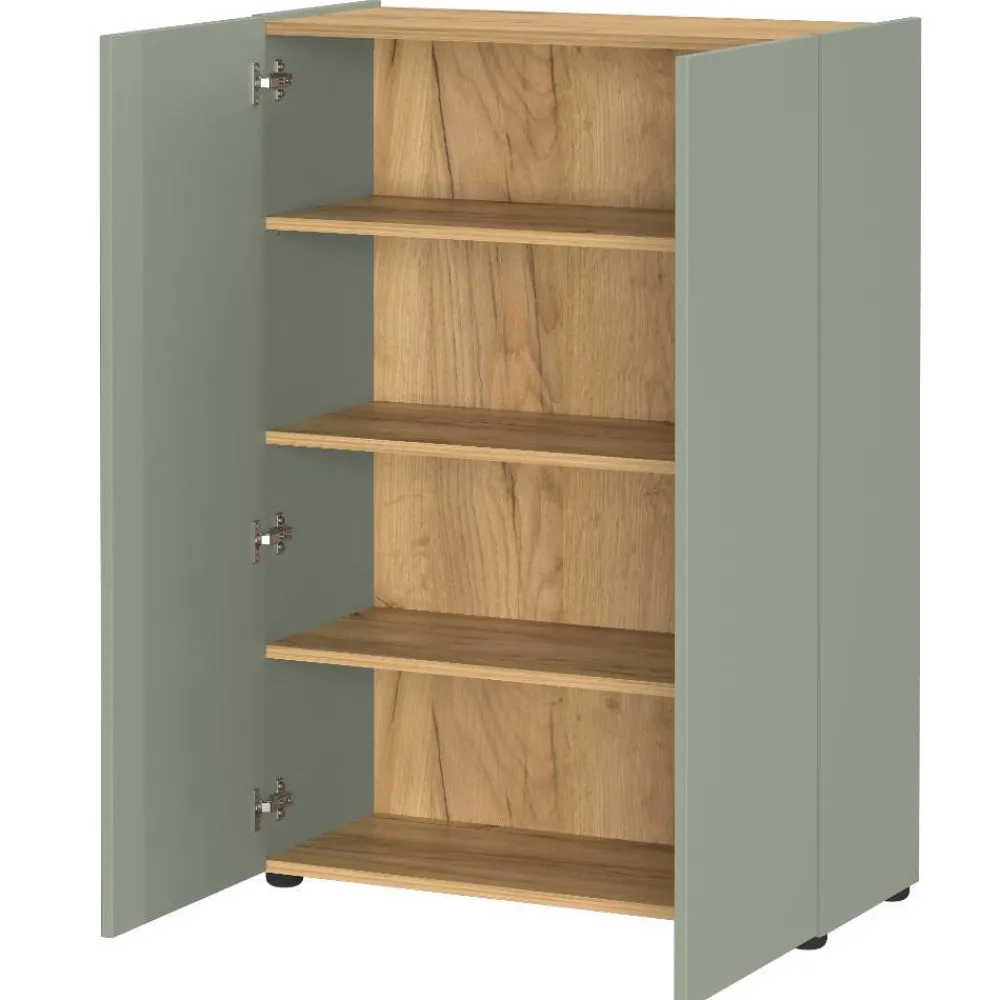 Mit zwei Drehtüren, drei verstellbaren Einlegeböden und einer stabilen Kippsicherung bietet die Schuhkommode Platz für bis zu zwölf Paar Schuhe. Dank der belastbaren Ober- und Unterböden (jeweils 15 kg) sowie Einlegeböden (jeweils 5 kg) bleibt Ihre Schuhsammlung stets gut verstaut. Die abgesenkte Deckplatte verleiht dem Möbelstück eine moderne Note.