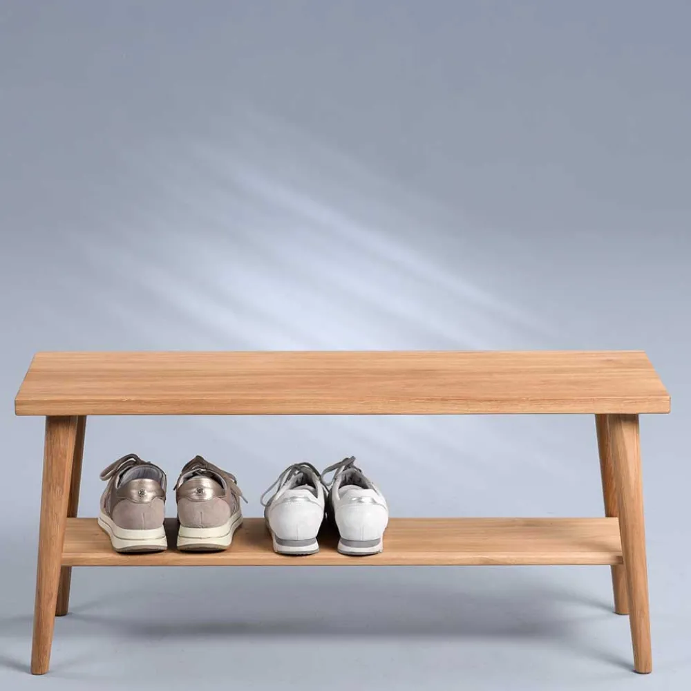 Die Garderobenbank „Liorys“ ist aus massiver Wildeiche gefertigt und verfügt über eine geölte Holzoberfläche. Das schräge Vierfußgestell sorgt für einen sicheren Stand und Stabilität.