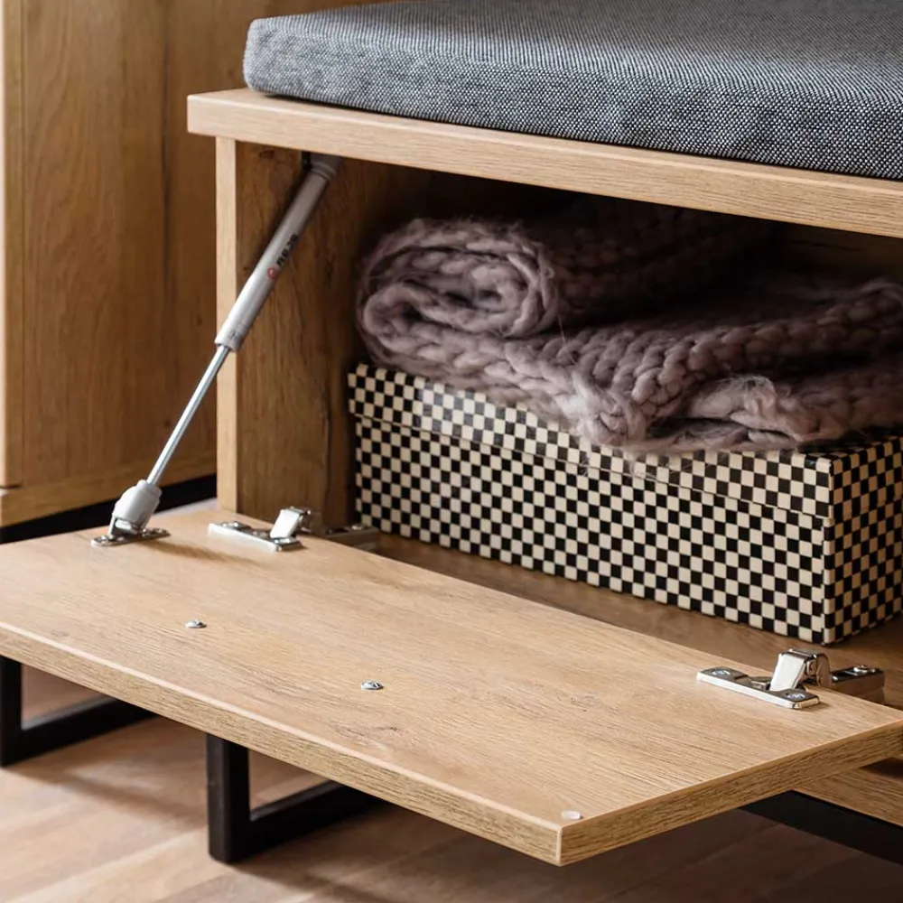 Unter der Sitzfläche verbirgt sich viel Stauraum. Zwei Klappen mit Dämpfung – ein sanftes Schließsystem, das Lärm reduziert und die Langlebigkeit erhöht – offenbaren je ein großes Fach, in dem bis zu vier Paar Schuhe Platz finden. Die kantigen Metall-Bügelgriffe in Schwarz ergänzen das moderne Design und erleichtern die Handhabung.