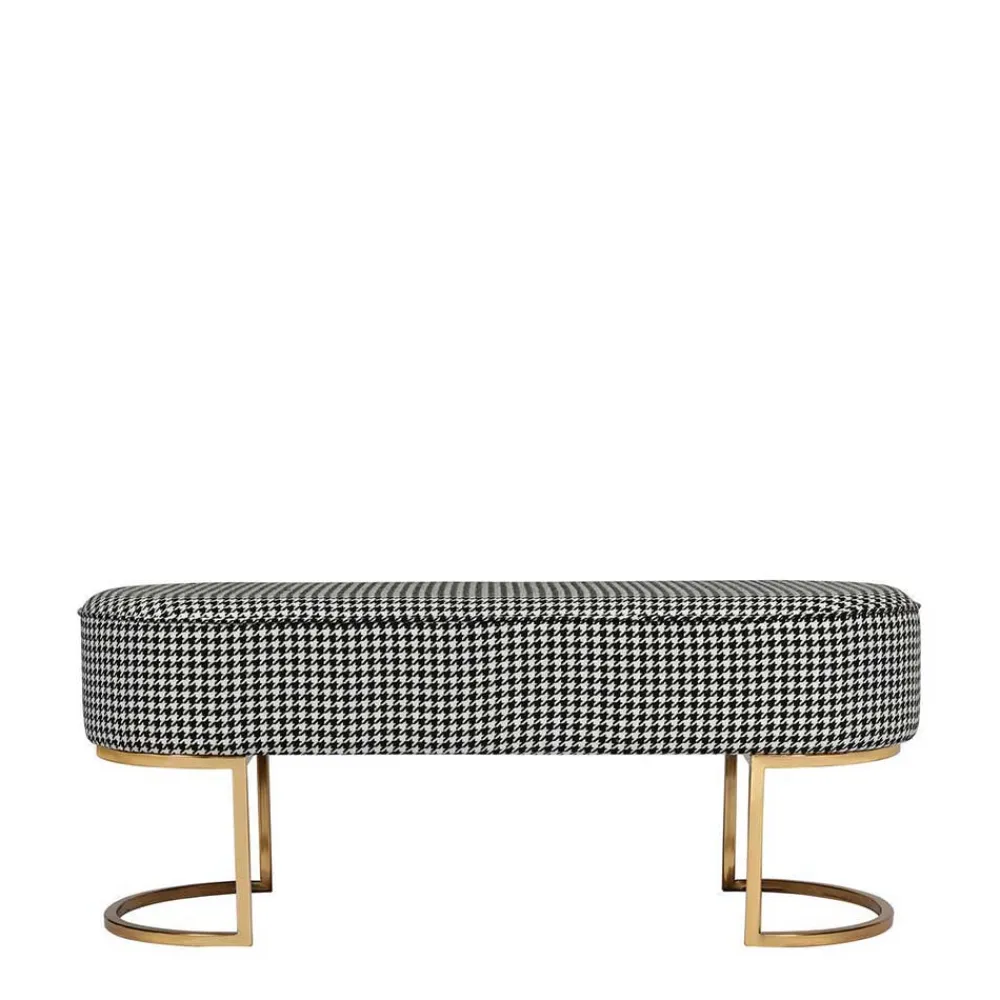 Die harmonische Kombination aus Schwarz, Weiß und goldfarbenen Akzenten sorgt für ein extravagantes, dabei aber geschmackvolles Erscheinungsbild. Besonders das klassische Hahnentritt-Muster des Bezugs sticht ins Auge – ein absolutes Designhighlight, das sowohl modische als auch wohnliche Eleganz ausstrahlt. Der hochwertige Webstoff aus 100 % Polyester überzeugt durch seine Strapazierfähigkeit und Langlebigkeit, ist dabei pflegeleicht und angenehm auf der Haut. Ergänzt wird das Ganze durch das halbrunde, stabile Bügelgestell aus goldfarbenem Metall – eine perfekte Balance aus Stabilität und Stil, die Ihrer Einrichtung einen Hauch von Glamour verleiht.