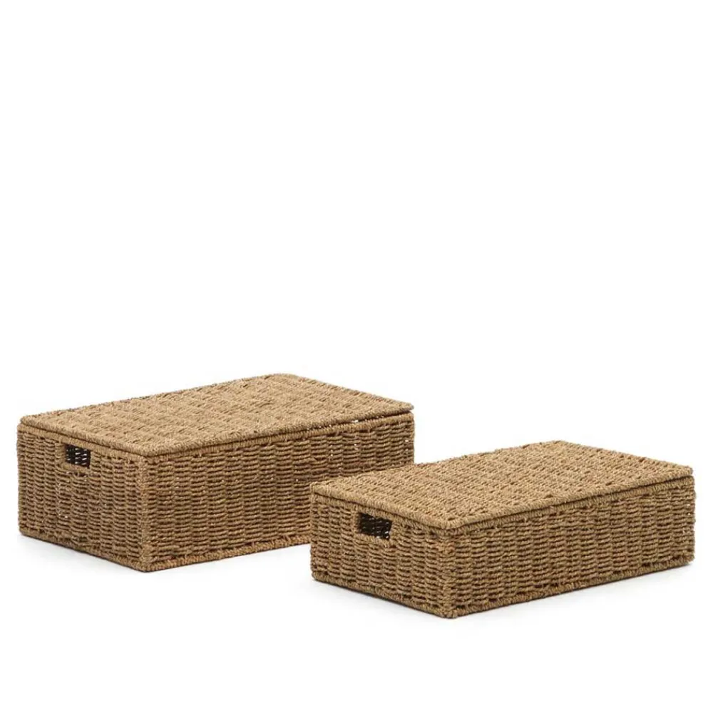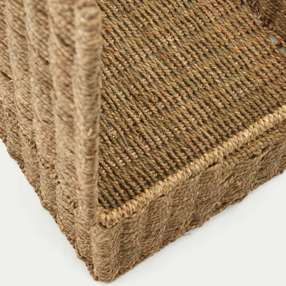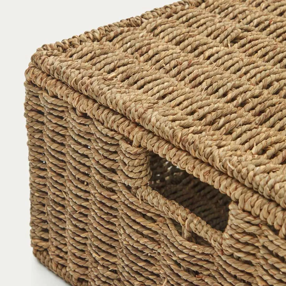Die Kisten bestehen aus hochwertigem Seegrasgeflecht, das von Hand gefertigt wird. Jede Kiste ist ein Unikat, mit individuellen Unterschieden in Form, Farbe und Struktur, was ihren rustikalen Charme unterstreicht. Der Innenrahmen aus Metall sorgt für Stabilität und Langlebigkeit.